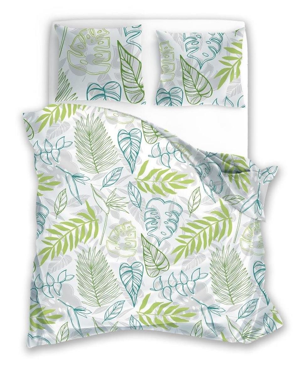 The bedding includes a duvet cover 140 x 200 cm and a pillowcase 70 x 90 cm . The covers have the same motif of large leaves of different types of plants in multiple shades of green on both sides. Inconspicuous gray leaves are still hidden under the green leaves and all this lies on a white background.