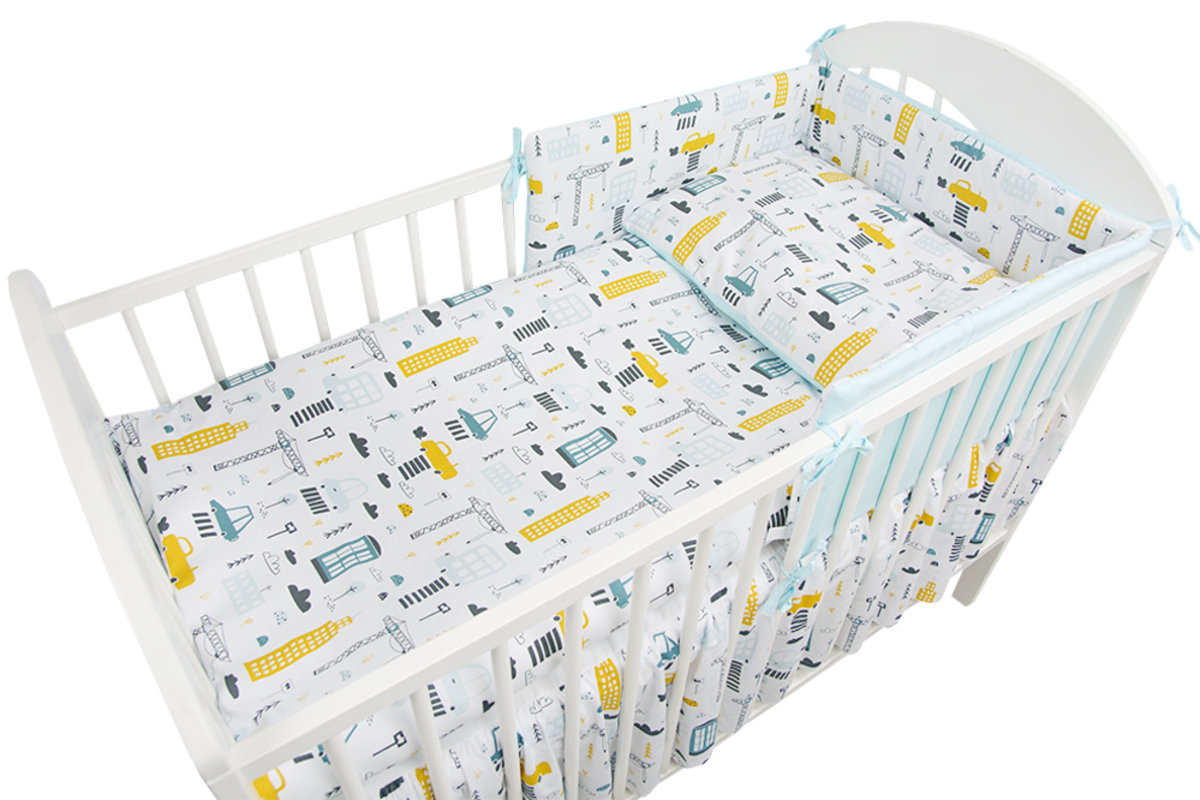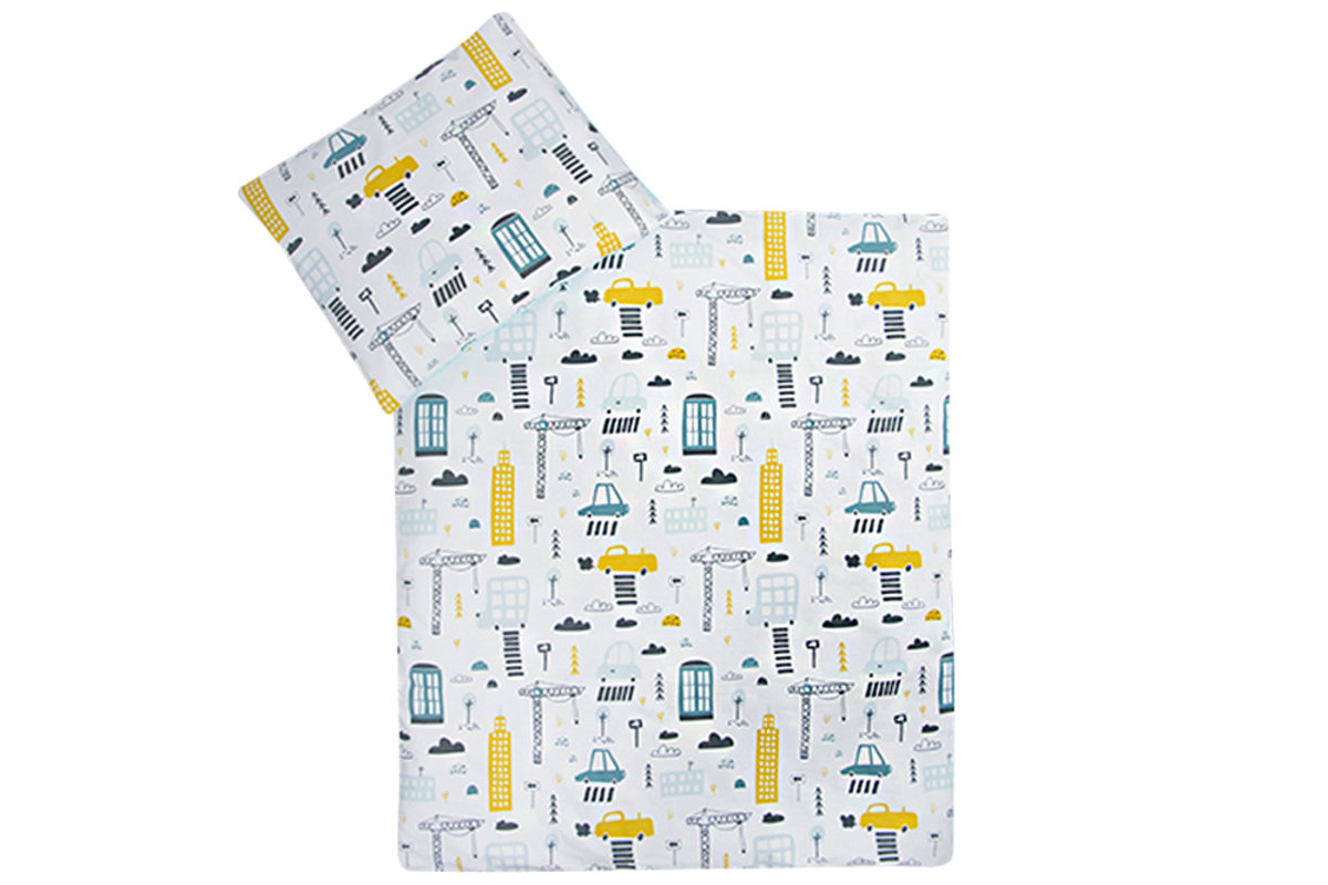 Bedding set with a City motif suitable for cots measuring 120x60 cm and 140x70 cm. The bedding is stylish and suitable for a baby cot.