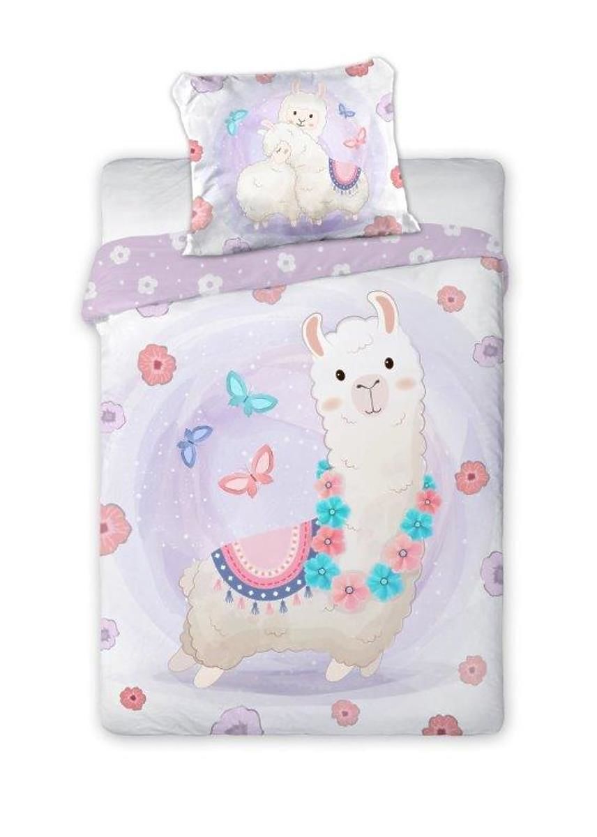 The bedding includes a duvet cover 135 x 100 cm and a pillowcase 60 x 40 cm . The coatings are double-sided . On the front side, you will be attracted by a llama with a flower wreath, butterflies and flowers, and the back side is in purple color with a small pattern of flowers, which follows the theme of the front side, viz. photo. The sheets are fastened with a practical zipper , which makes it easier to cover pillows and duvets.