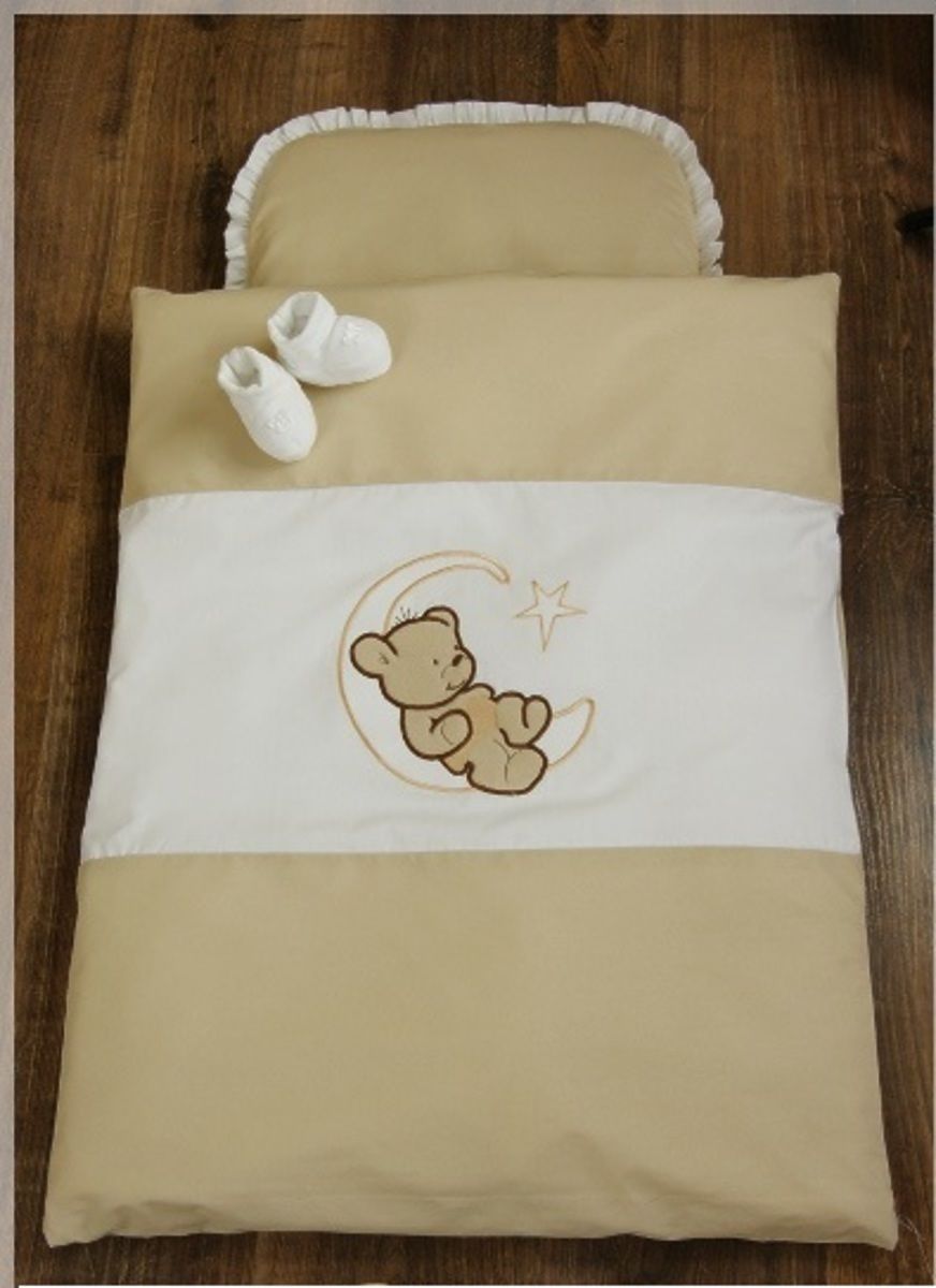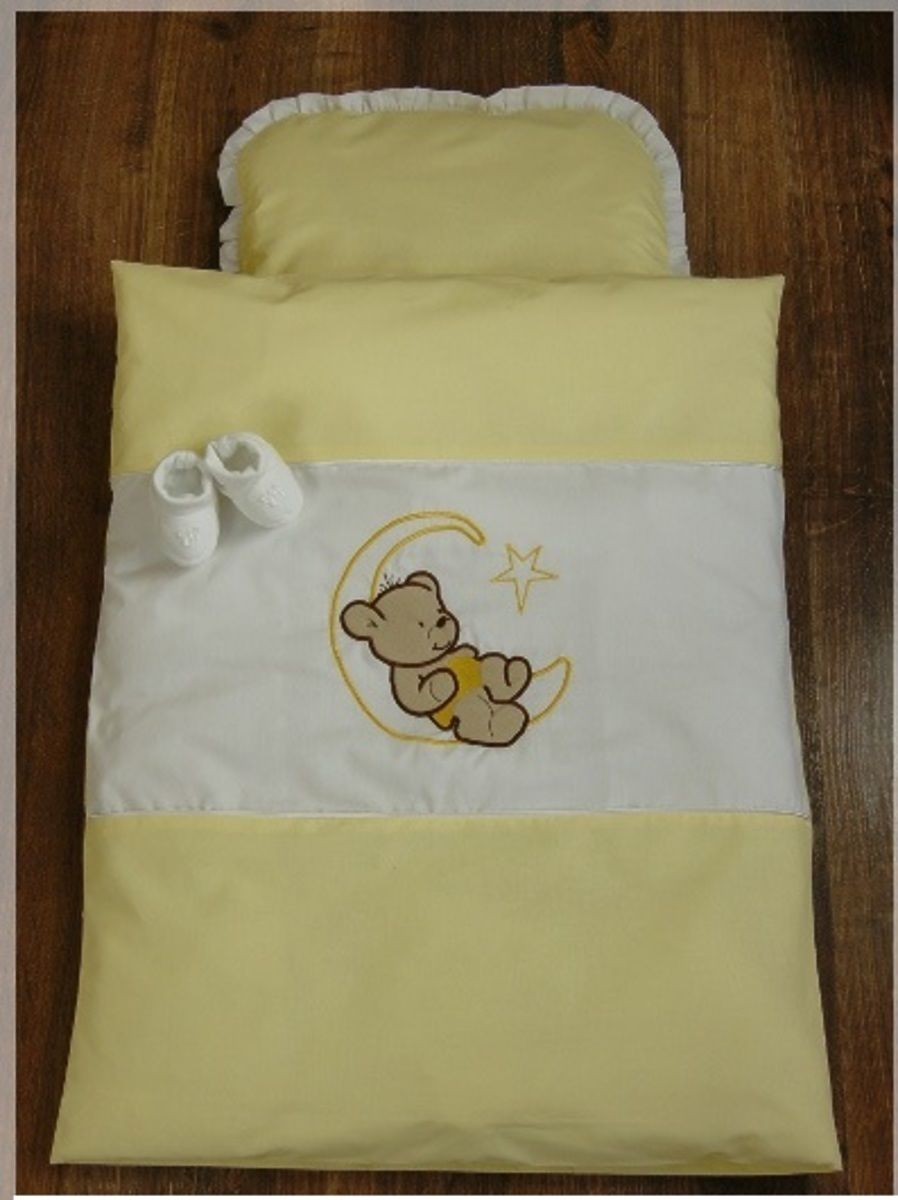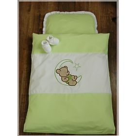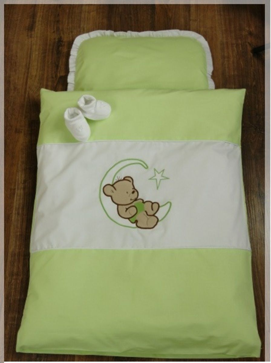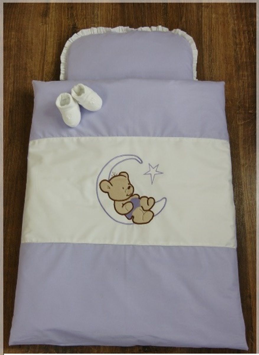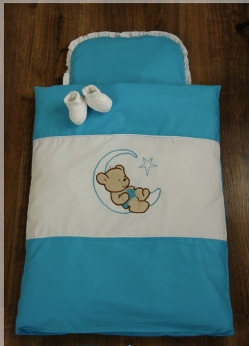 Beautiful 4 piece set bedding with filling in the stroller looks lovely and enlivens every pram. Beautiful teddy bear motif is suitable for all babies. Bright colors, which disposes sheets are vibrant and beautiful. Fade even after many washings. Beautiful set of sheets is made of a material which is pleasant to the touch and feathery, high quality of 100% cotton. Turning the set of sheets is safely hidden lock. Linen has certified ÖKO-TEX. Blanket with a pillow is filled with high-quality filler, which is made of silicone and anti-allergic fibers. Blanket with a pillow have a long service life, maintain an optimal temperature during all seasons. Blankets and pillows may be used throughout the year, it is suitable for each baby. Set performs a certificate of quality and safety ÖKO-TEX Standard 100 certified fabrics has also "Safety for Children". Your child will be perfectly safe. The 4 - piece bedding set includes: - Pillow with dimensions of 30 x 35 cm - duvet covers with embroidered teddy bear with dimensions of 70 x 55 cm - Cushion 30 x 35 cm - blanket measuring 70 x 55 cm