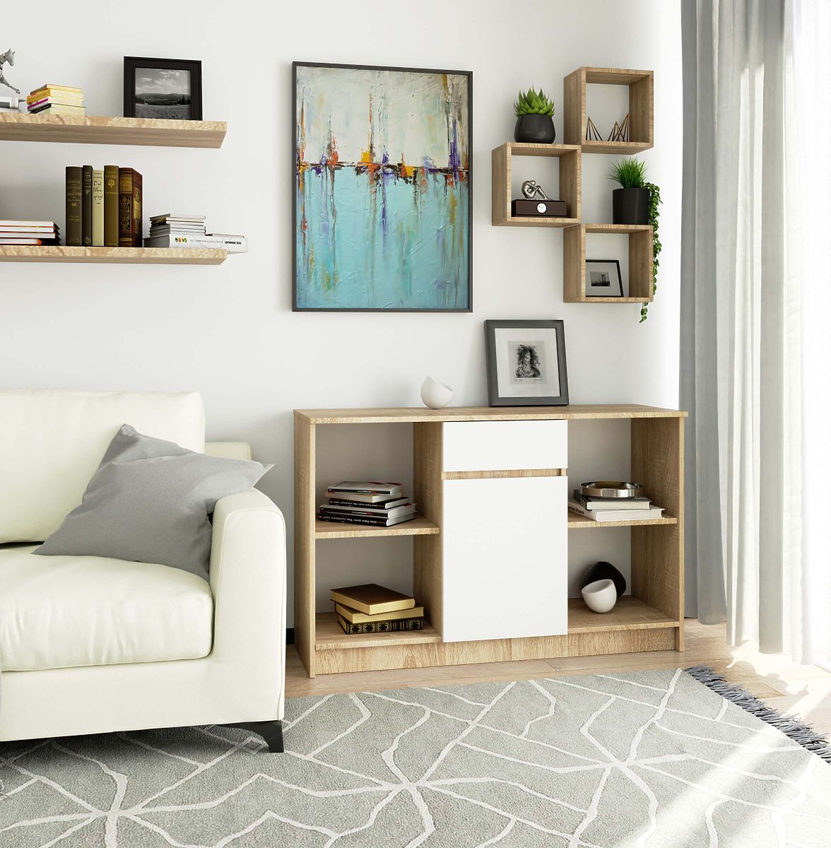 CHEST OF DRAWERS B-17 120 cm 1 DRAWER 1 DOOR SONOMA / WHITE is an extremely versatile and functional piece of furniture. It is divided into 3 zones, allowing for the storage of various items. In the middle section, there is a drawer and a cabinet with a door, inside which is a shelf. Another advantage of the chest is the possibility of connecting it with the B-17 desk, which is also available in our offer. Their joint composition forms a corner desk, which is an extremely practical office equipment. The ability to lock the drawer allows for the storage of important documents and valuable items.