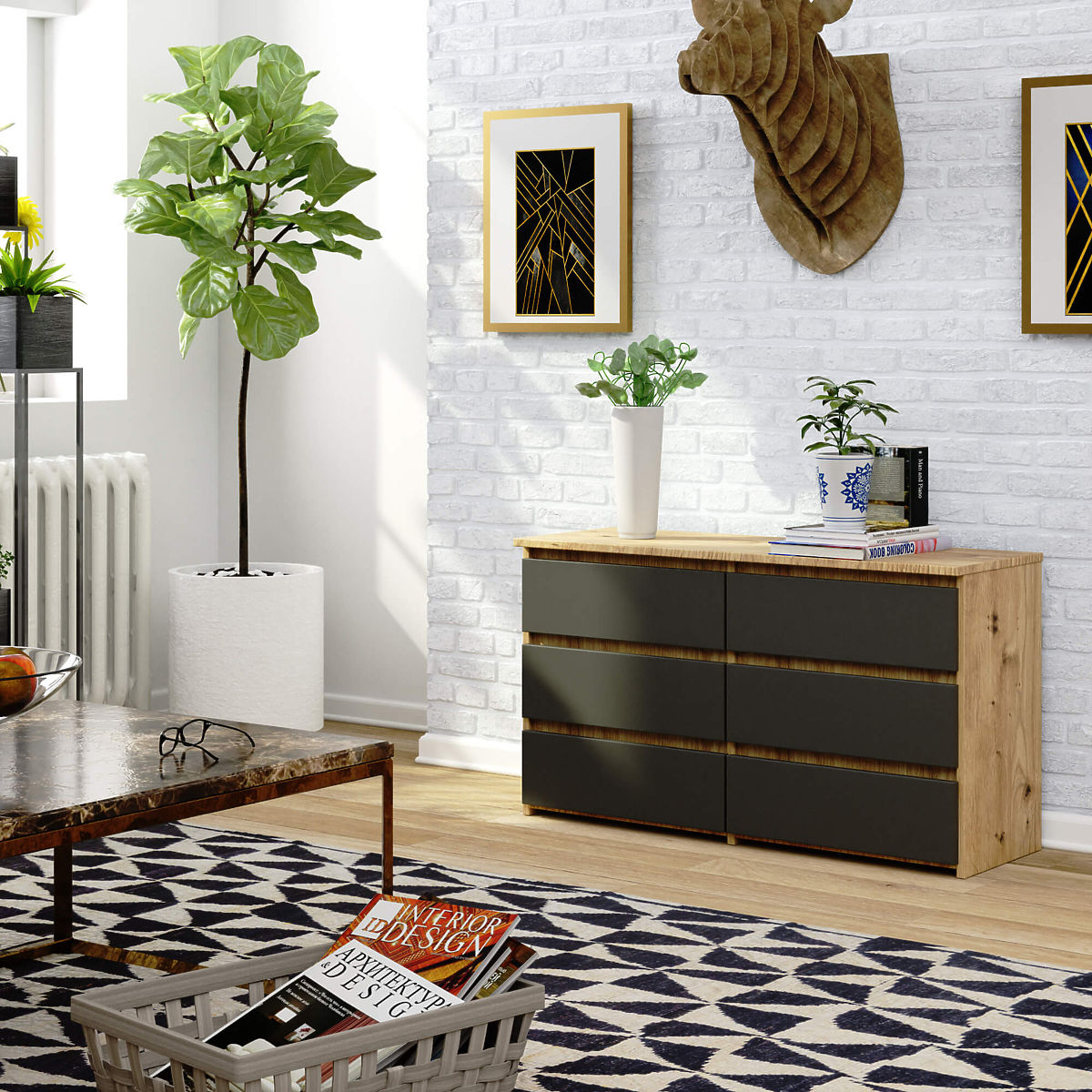 In furniture making, special emphasis is placed on the functionality of products and their high aesthetic value. A great example is the CL 100 cm chest of drawers. This practical piece of furniture is made from abrasion-resistant laminated board, ensuring its durability and strength. Its six spacious drawers can accommodate various books, documents, or small items. Some of our customers choose to store clothes or underwear. The artisan oak chest with gray fronts has an elegant design. Its simple form and elegant finish suit both classic and elegant interiors, as well as romantic ones. This exceptional piece of furniture presents itself perfectly in an elegant living room or cozy bedroom. It is also used as part of a wardrobe or hallway. The 6-drawer chest is appreciated by both individual customers and entrepreneurs. Thanks to its impeccable appearance and extraordinary capacity, it is well-suited as part of office furnishings.