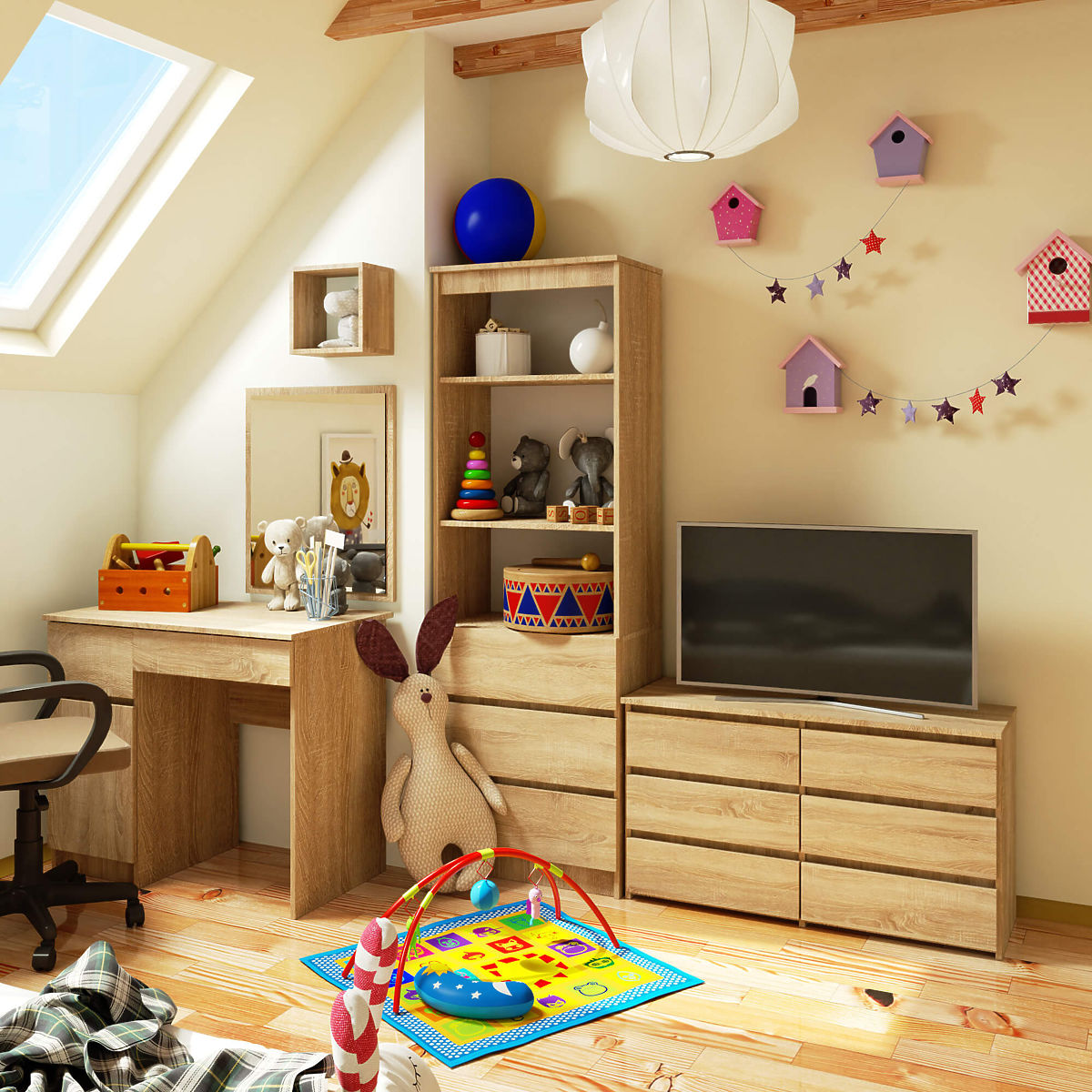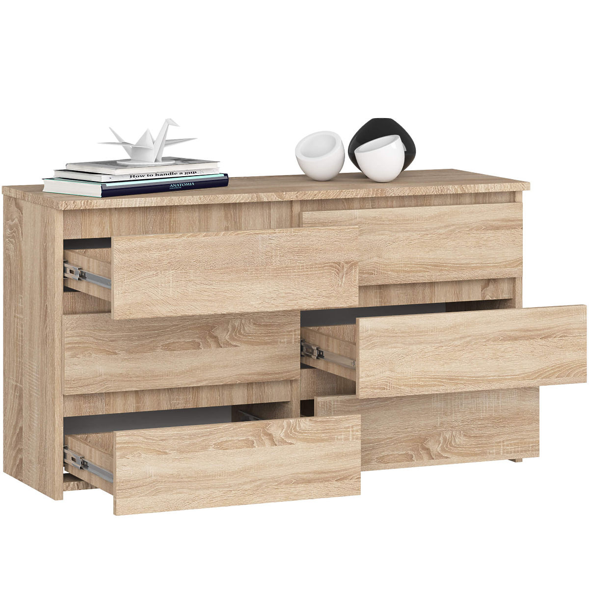 In furniture making, special emphasis is placed on the functionality of products and their high aesthetic values. A great example is the CL 100 cm chest of drawers. This practical piece of furniture is made from laminated board resistant to abrasion, ensuring its durability and resilience. The six spacious drawers can accommodate various books, documents, or small items. Some of our customers choose to store clothes or underwear. The oak sonoma chest of drawers has an elegant design. Its simple form and elegant finish fit both classic and elegant interiors, as well as romantic ones. This exceptional piece of furniture perfectly suits a stylish living room or a cozy bedroom. It is also used as part of a wardrobe or hallway. The chest of drawers with 6 drawers is appreciated by both individuals and entrepreneurs. Thanks to its flawless appearance and extraordinary capacity, it is perfect as part of office equipment.