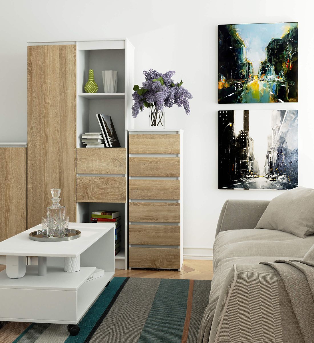 - elegant appearance - the chest of drawers is simple in form, characterized by a stylish white color and oak sonoma fronts,