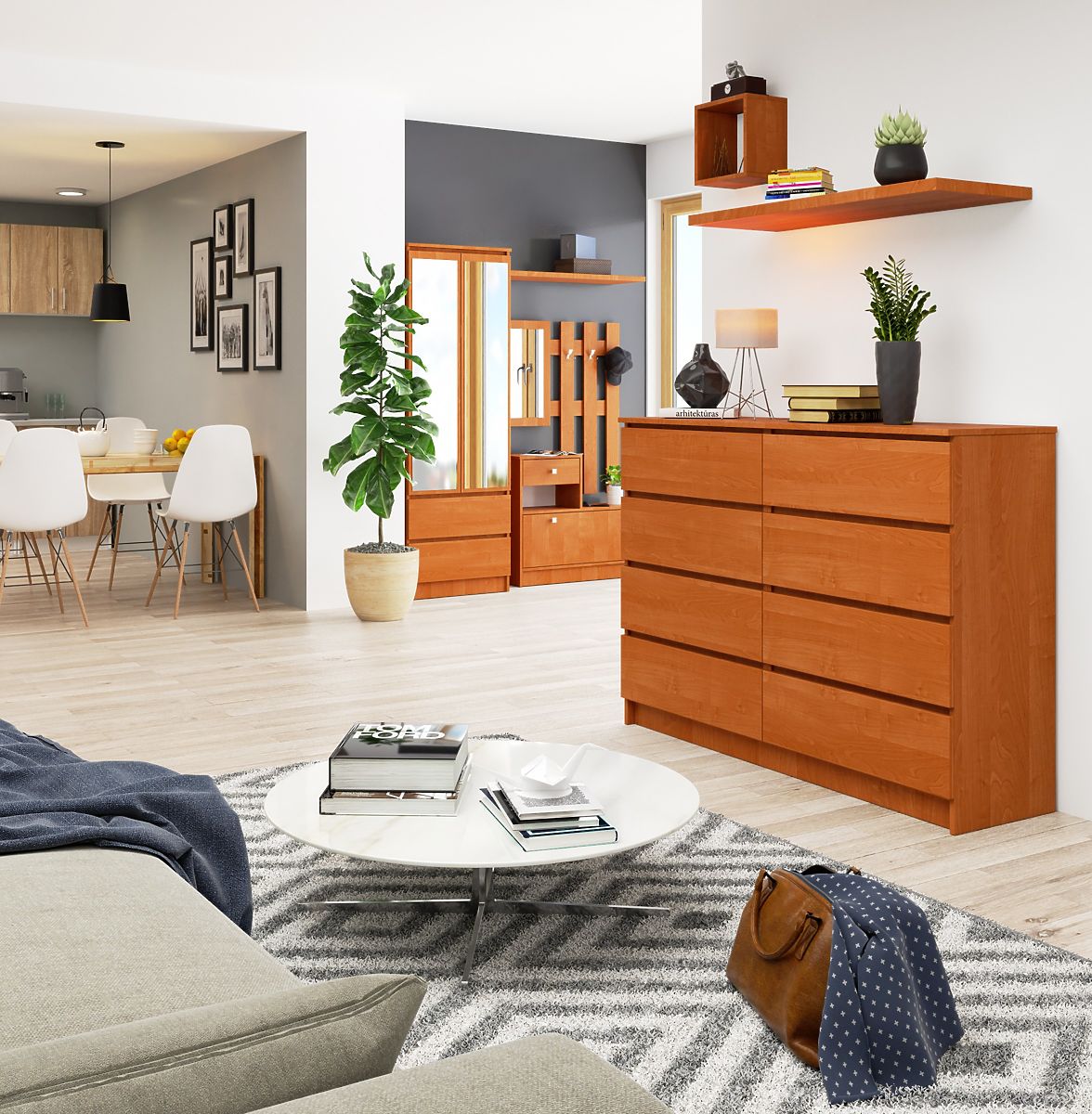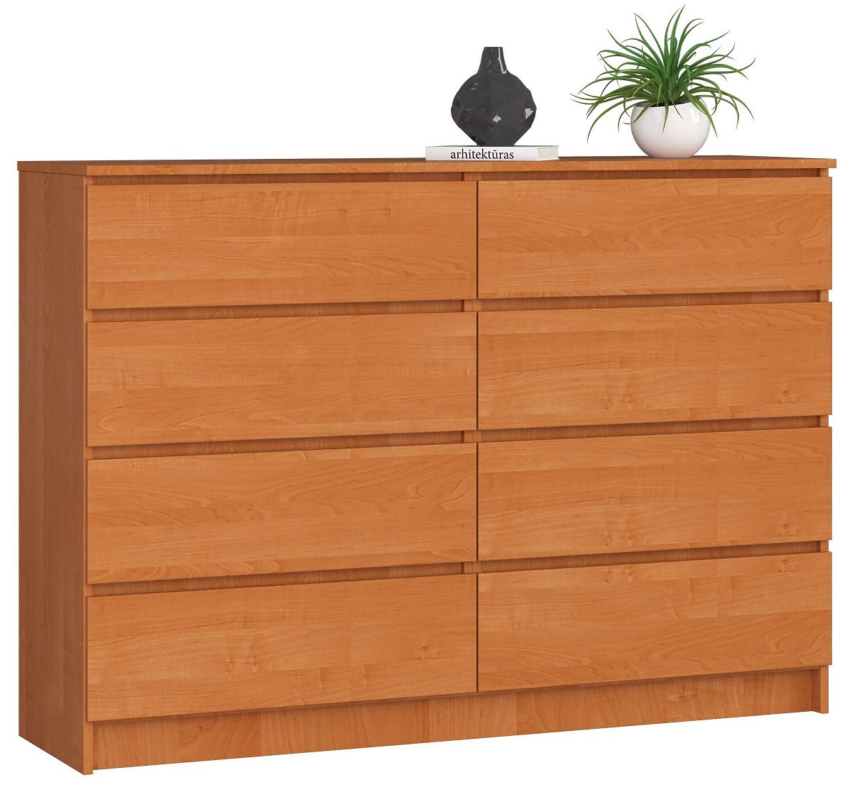 The K140 chest of drawers in alder color is designed for lovers of traditionally furnished interiors. Its universal color and simple furniture shapes ensure it fits well in spaces such as offices, hotel rooms, as well as residential interiors - living rooms, bedrooms, hallways, or dining rooms. The characteristic features of this chest of drawers are its timeless design, sturdy construction, practical use, and easy maintenance. Equipped with eight spacious drawers, the product allows for the storage of documents, clothing, and many other necessary items in the room. Its affordable price is another advantage. We also recommend exploring other furniture elements available in this series.