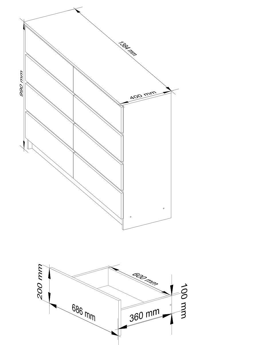 Depth - 40cm- The body of the chest is made from 16mm white matte laminated board, abrasion-resistant- Fronts made from 19mm ACRYLIC board in white high gloss finish
