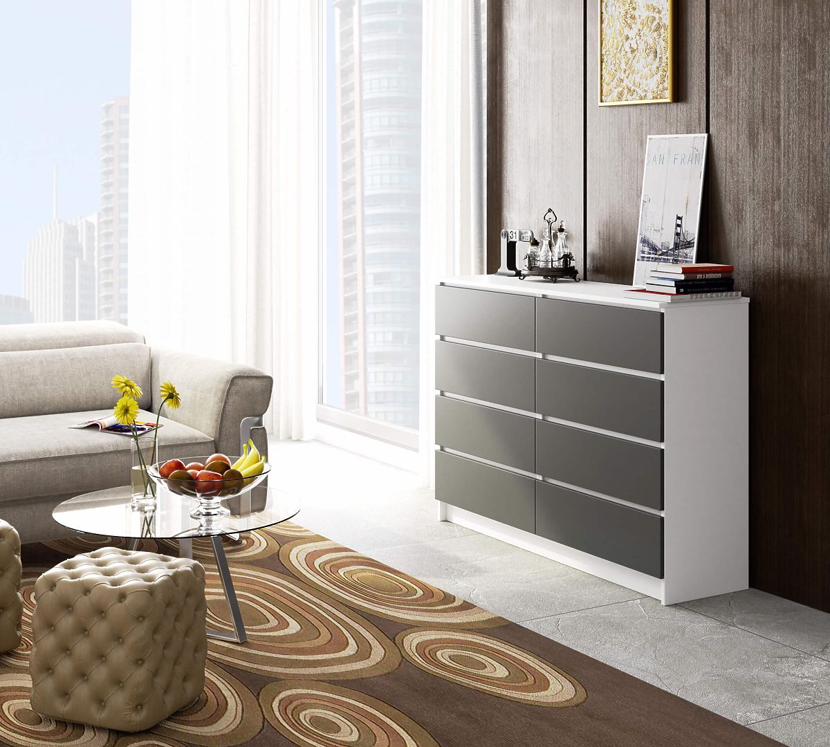 White and gray chest of drawers with 8 drawers and ABS edge protection. .. more