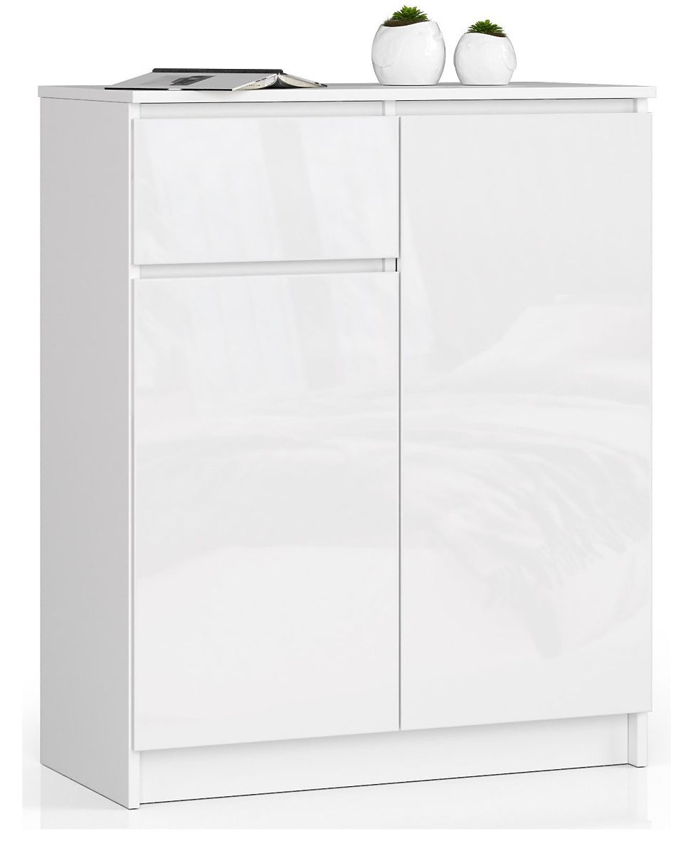 This small white chest of drawers features a practical drawer and two closed cabinets, each with two shelves. The furniture is characterized by a solid construction and meticulous craftsmanship. The presented offer pleases the eye and meets the expectations of even the most demanding customers in terms of functionality. The K 80 cm chest combines a white body with high-gloss front surfaces in the same color. This tasteful furniture will undoubtedly look great in many interiors designed in Scandinavian, minimalist, or modern styles.