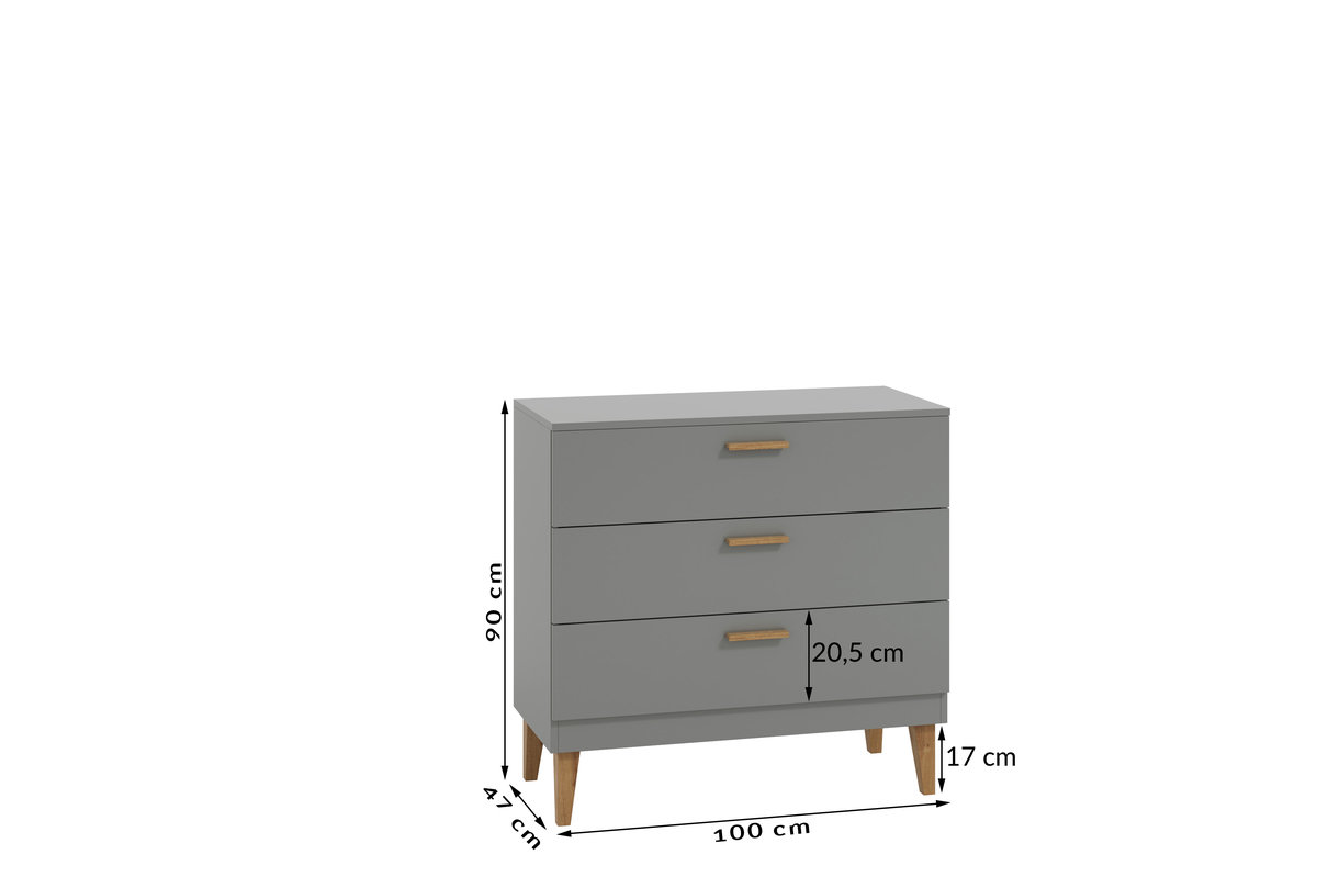 Modern gray KUBI chest of drawers with 3 spacious drawers. The chest of drawers is suitable for children's rooms for children and students. The timeless Scandinavian style of the chest of drawers testifies and combines perfectly with other pieces of furniture from the same collection.