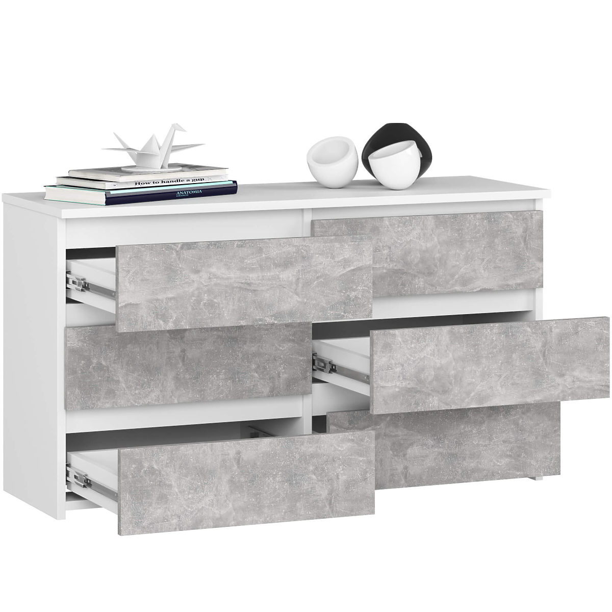 In furniture making, special emphasis is placed on the functionality of products and their high aesthetic values. A great example is the CL 100 cm dresser. This practical piece of furniture is made from abrasion-resistant laminated board, ensuring its durability and resilience. The six spacious drawers can accommodate various books, documents, or small items. Some of our customers choose to store clothes or underwear. The white dresser with concrete fronts has an elegant design. Its simple form and elegant finish fit both classic and elegant interiors, as well as romantic ones. This exceptional piece of furniture presents itself perfectly in an elegant living room or a cozy bedroom. It is also used as part of a wardrobe or hallway. The dresser with 6 drawers is appreciated by individual customers and entrepreneurs alike. Thanks to its flawless appearance and extraordinary capacity, it is ideal as part of office equipment.