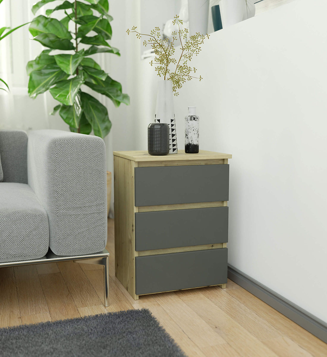 Elegant nightstand with 3 drawers in artisan oak and gray. .. more