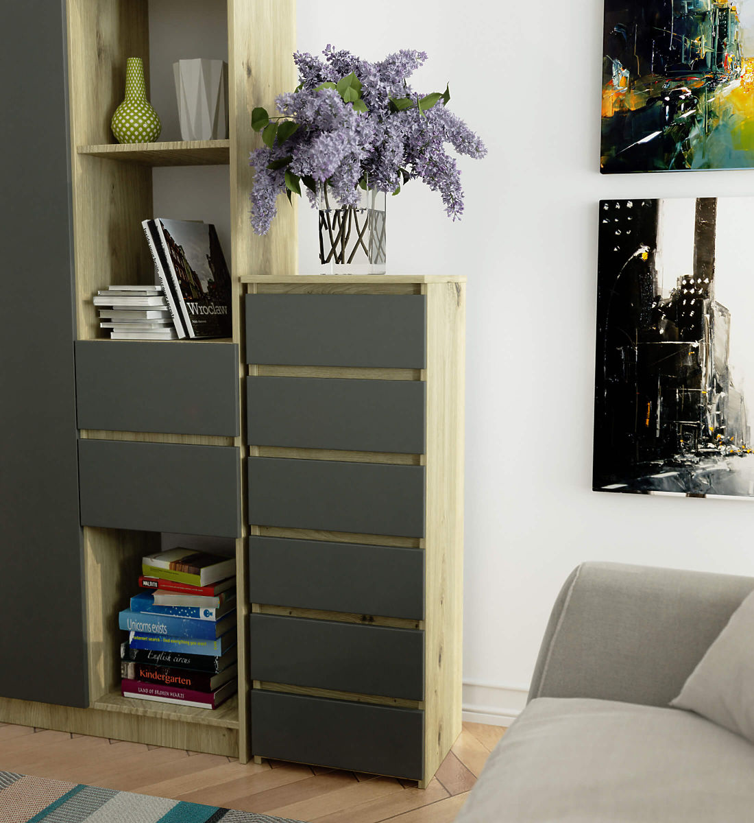 Dressers are a popular type of furniture placed next to the bed. A lamp is most often found on its top, while inside are items that facilitate rest and sleep. Those looking for an elegant dresser should pay attention to the CL6 40 cm dresser in artisan oak color with gray fronts. It will look beautiful in any bedroom. It can also be placed in a children's room.