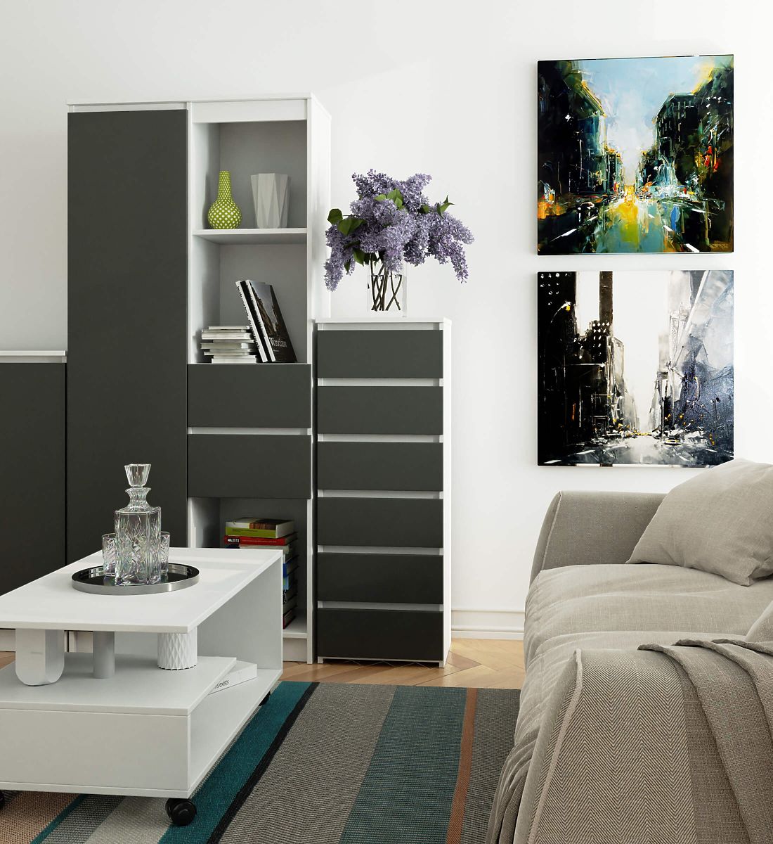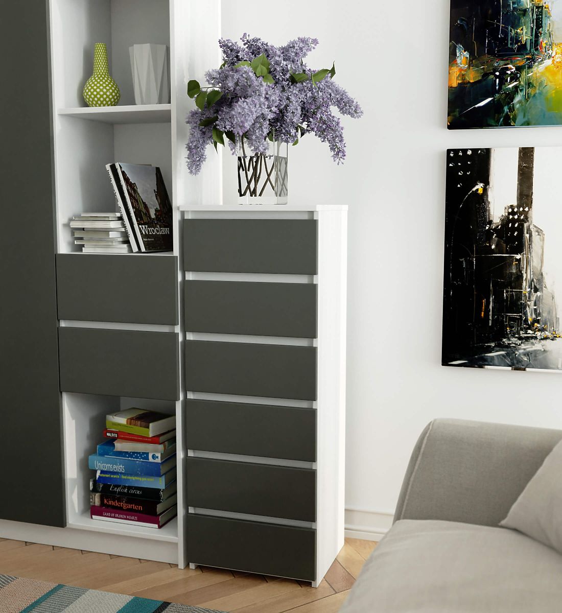 Dressers are a popular type of furniture placed next to the bed. A lamp is most often found on its top, while inside are items that facilitate rest and sleep. Those looking for an elegant dresser should pay attention to the CL6 40 cm dresser in white with graphite gray fronts. It will look beautiful in any bedroom. It can also be placed in a children's room.