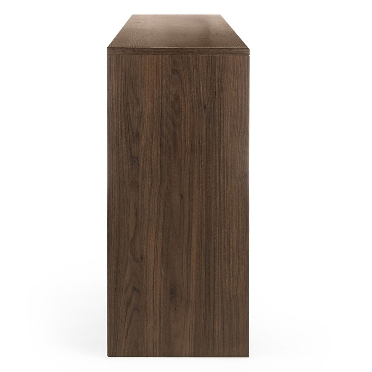 The four-door sideboard Moku combines minimalist design with functionality. The unique rounding of the front surfaces and the walnut villa color give it lightness and elegance, making it suitable for any interior.