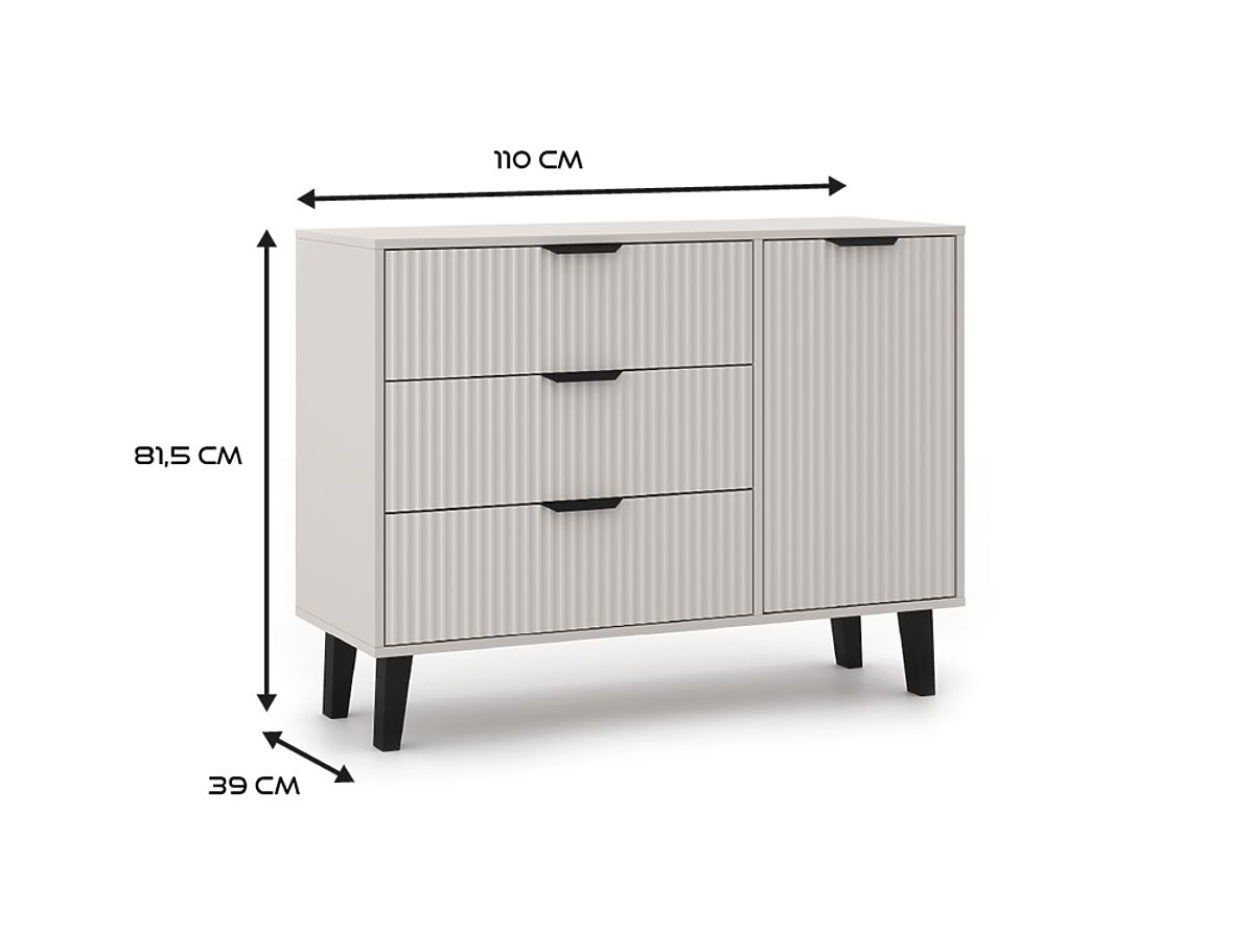 The door and drawer fronts are adorned with elegant grooving, giving the furniture a distinctive look inspired by slats. The piece is complemented by black handles and high, black legs, adding lightness and exceptional style to the furniture.
