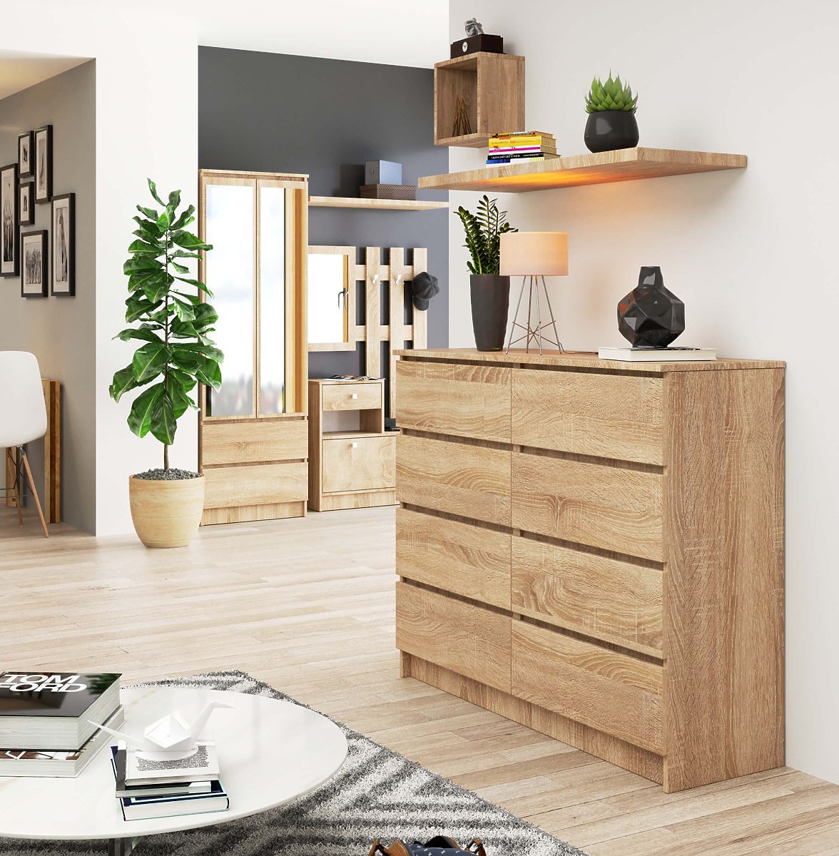 Eight drawers to store all necessary items in the room, and a 120-centimeter wide top - that's the K120 sideboard in the fashionable oak sonoma color. This high-quality product features a sturdy construction ensuring durability and a universal design. Another advantage of this functional furniture, which will look great in the living room, bedroom, dining room, or office, is its attractive price. In our online store, customers can also expect additional interior furnishing proposals in oak sonoma color, pleasantly surprising with their practicality both in the office and at home. We recommend taking advantage of our offer and assembling a set tailored to specific needs.