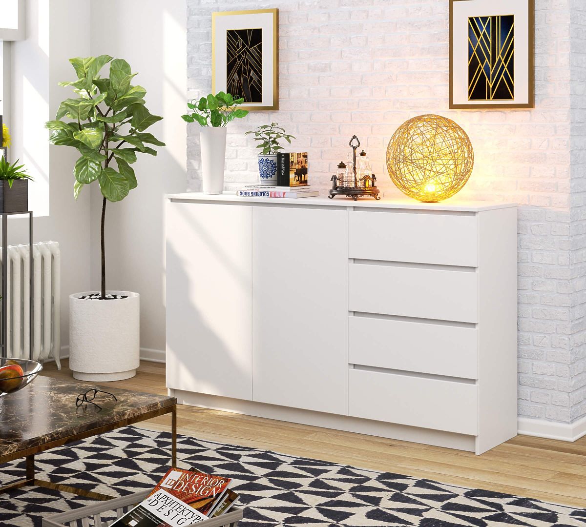 The white sideboard also boasts high practical value. It features 4 easily openable drawers and 2 very large shelves. Such a construction ensures convenience in storage and is a very functional solution. You can store all necessary items in the sideboard and have them always in one place, within reach.