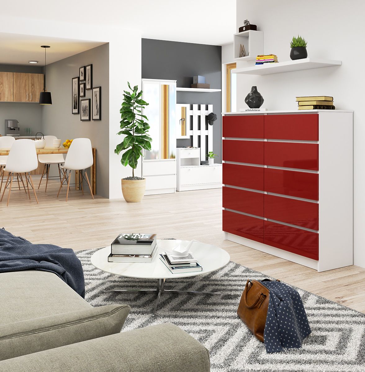 The K model sideboard is furniture with a striking, energetic color. The deep red glossy fronts and white matte body look very interesting. The effect is enhanced by the glossy structure, which reflects light and creates impressive reflections on the furniture's surface.