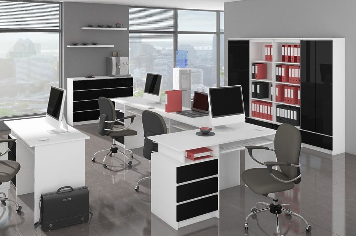 The body of the sideboard is made of 16mm white semi-matte laminated board, while the fronts are made of 19mm high gloss black acrylic board.