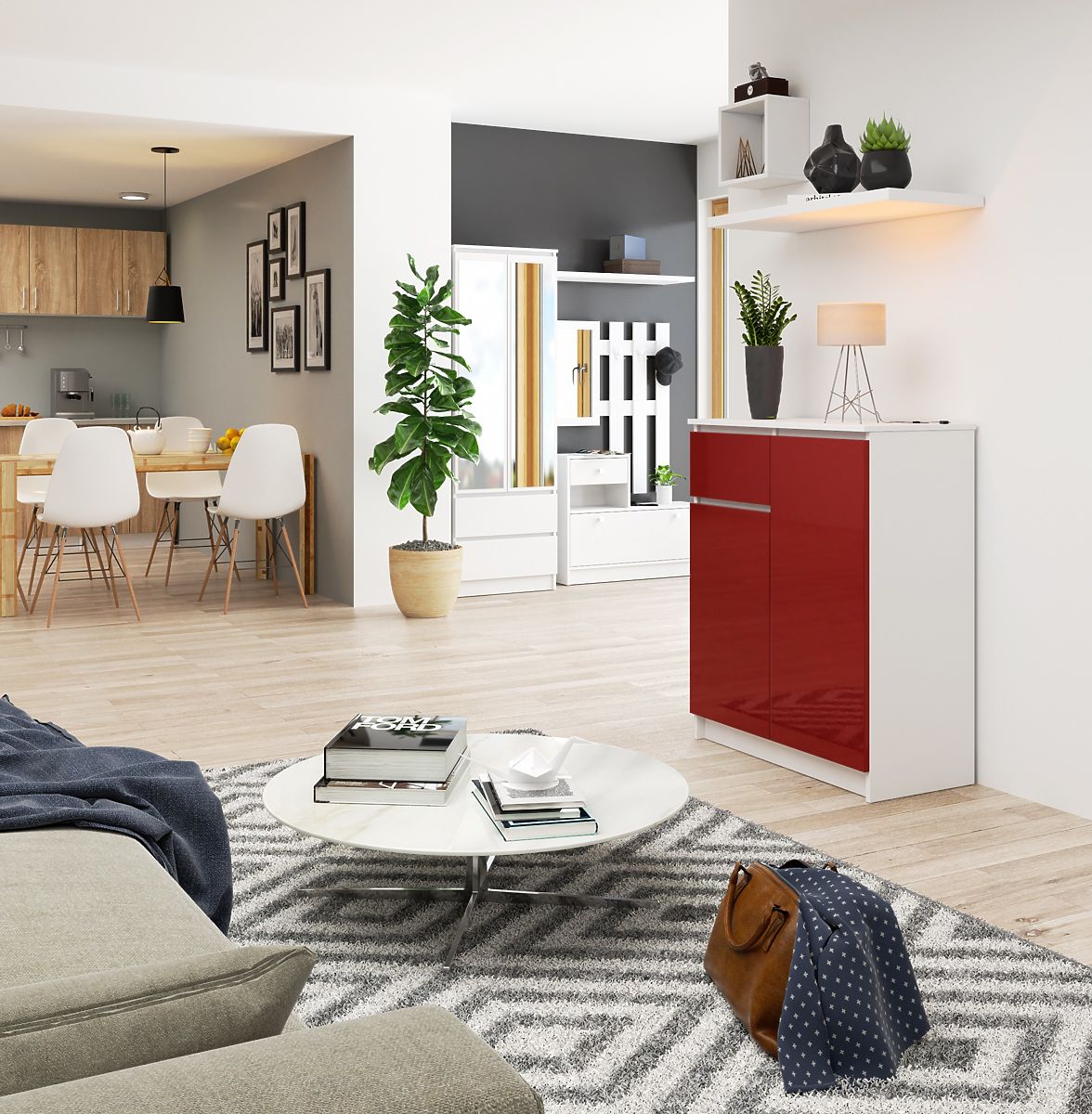 The impressive red glossy front panels are sure to appeal to all lovers of vibrant, original colors and interestingly designed furniture that will undoubtedly enliven any space. The furniture we present consists of a drawer and two closed cabinets. Each contains two shelves for versatile use. The K 80 cm sideboard combines a white body with red front panels. This compact piece of furniture will fit well in a youth or living room, but it can also be used in other rooms, including offices.