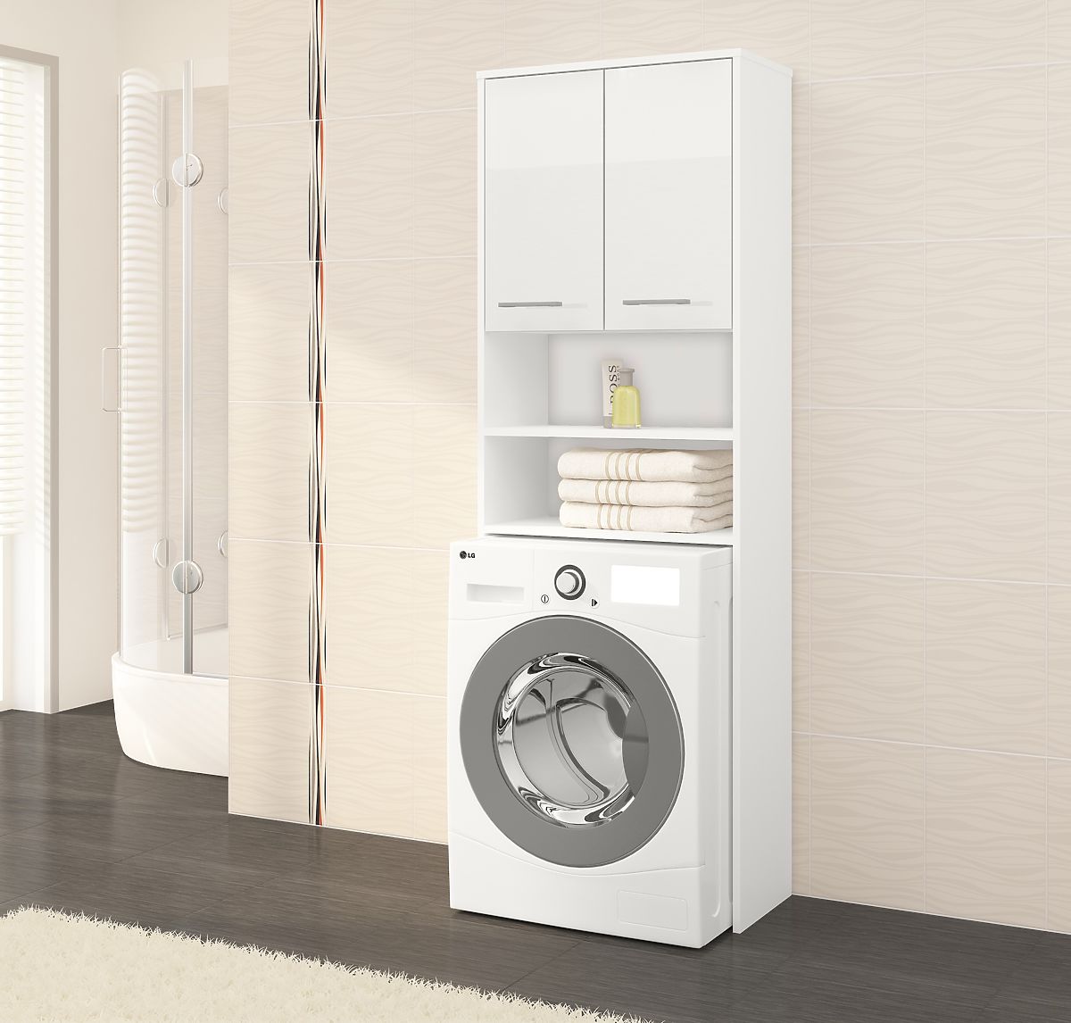 Do you have a small bathroom and still lack space? We've found the perfect solution for those who want to gain a little extra storage space. The spacious cabinet above the washing machine provides additional storage space. Shelves easily accommodate towels, cosmetics, or cleaning supplies. This exceptional bathroom shelf is made from 16mm abrasion-resistant laminated board. The smooth surface also makes cleaning easier. The cabinet above the washing machine is designed to fit into various interiors. Its flawless white color fits perfectly into rustic, modern, and classic interiors. The furniture can be combined with other elements from our collection, creating a unique and unrepeatable set tailored to your needs. A special advantage of the bathroom shelf is that it gently covers the washing machine. This maximizes the use of the entire space. The cabinet has a height of 180 cm and a width of 64 cm, with a depth of 30 cm.