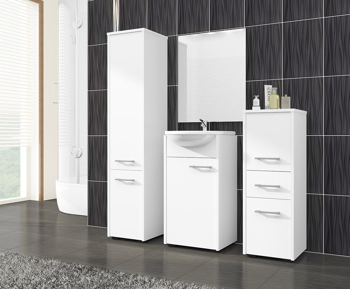 White furniture always fits perfectly in bathrooms. Therefore, a bathroom column in this shade is an excellent choice for both smaller and larger spaces. Our offered column is a two-door model. It has a larger upper and a smaller lower door. They feature elegant, attractive handles for opening. Behind these doors is a functional shelf. In the upper part of the column, we can store items like laundry detergents, liquids, or towels. The lower part of the cabinet is an ideal place for small accessories and cosmetics. The elegant white color brightens any interior and blends well with the color of tiles or other furniture. The optimal width and depth of the cabinet ensure it does not obstruct movement in the bathroom or the use of its facilities. The cabinet's construction is made from exceptionally high-quality laminated board. It is therefore resistant to damage and intensive use. Edges covered with ABS material ensure the aesthetic appearance of this furniture throughout its use.