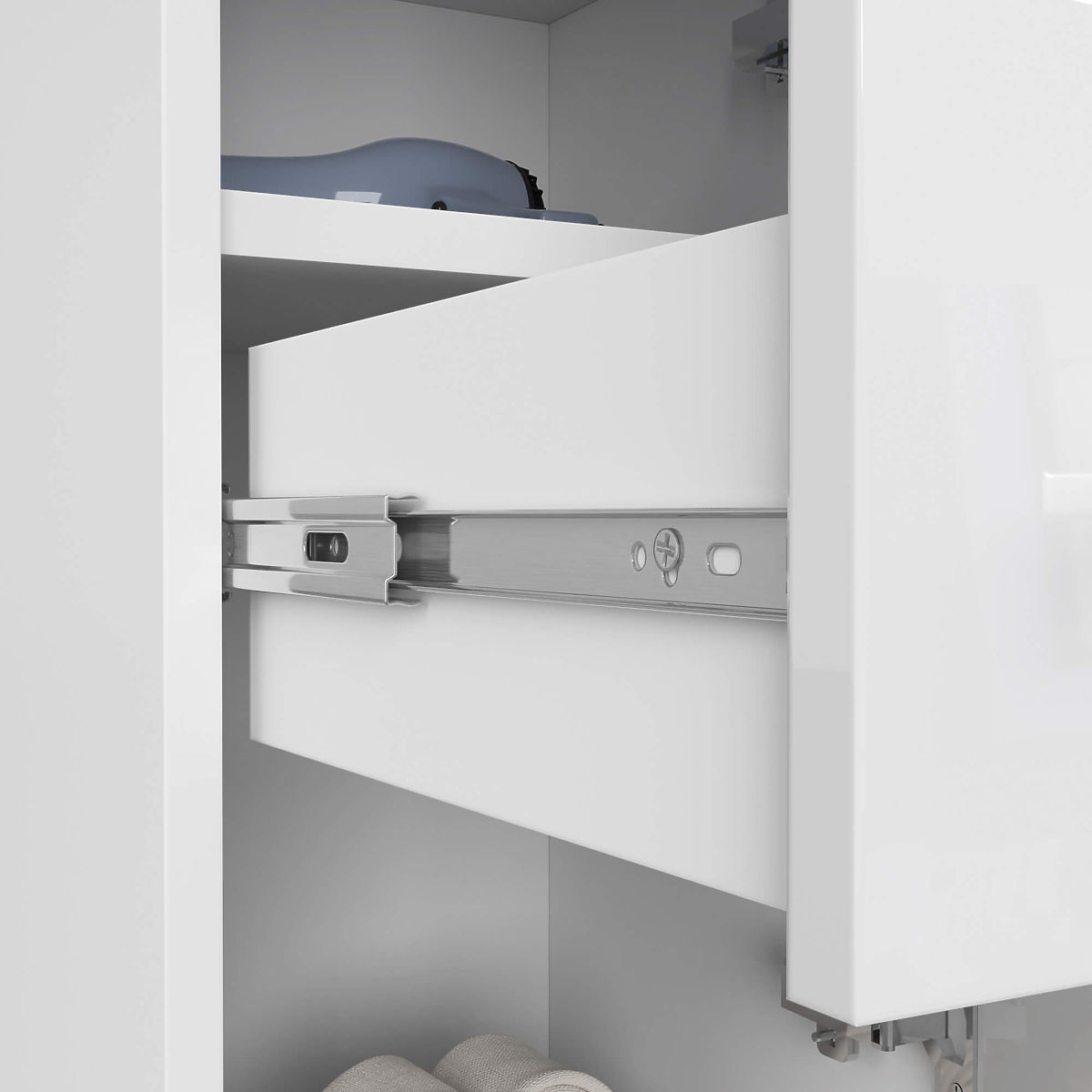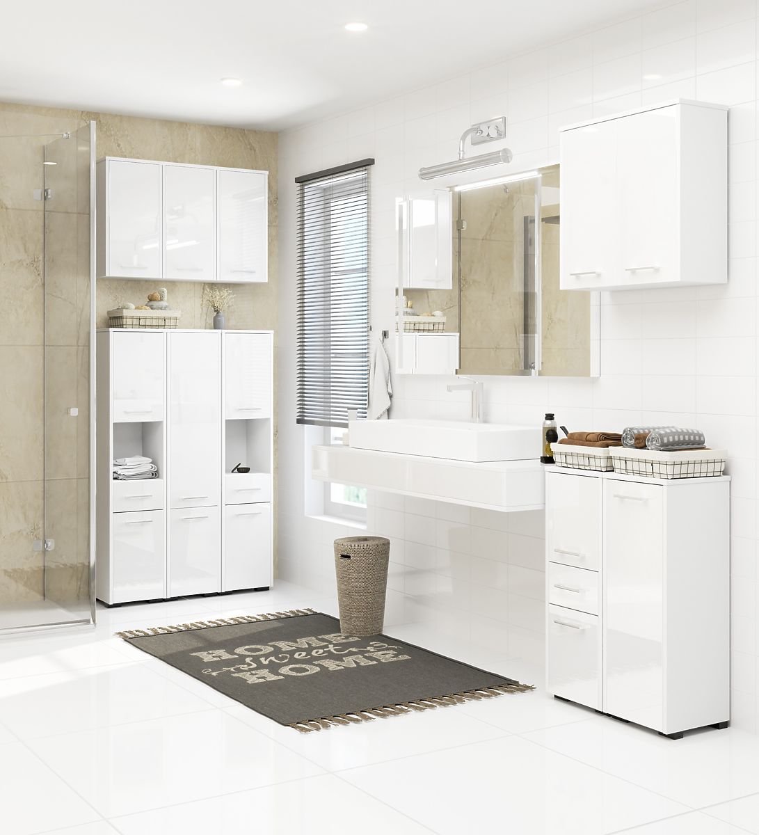 Versatile white gloss bathroom cabinet with drawers and shelves. .. more
