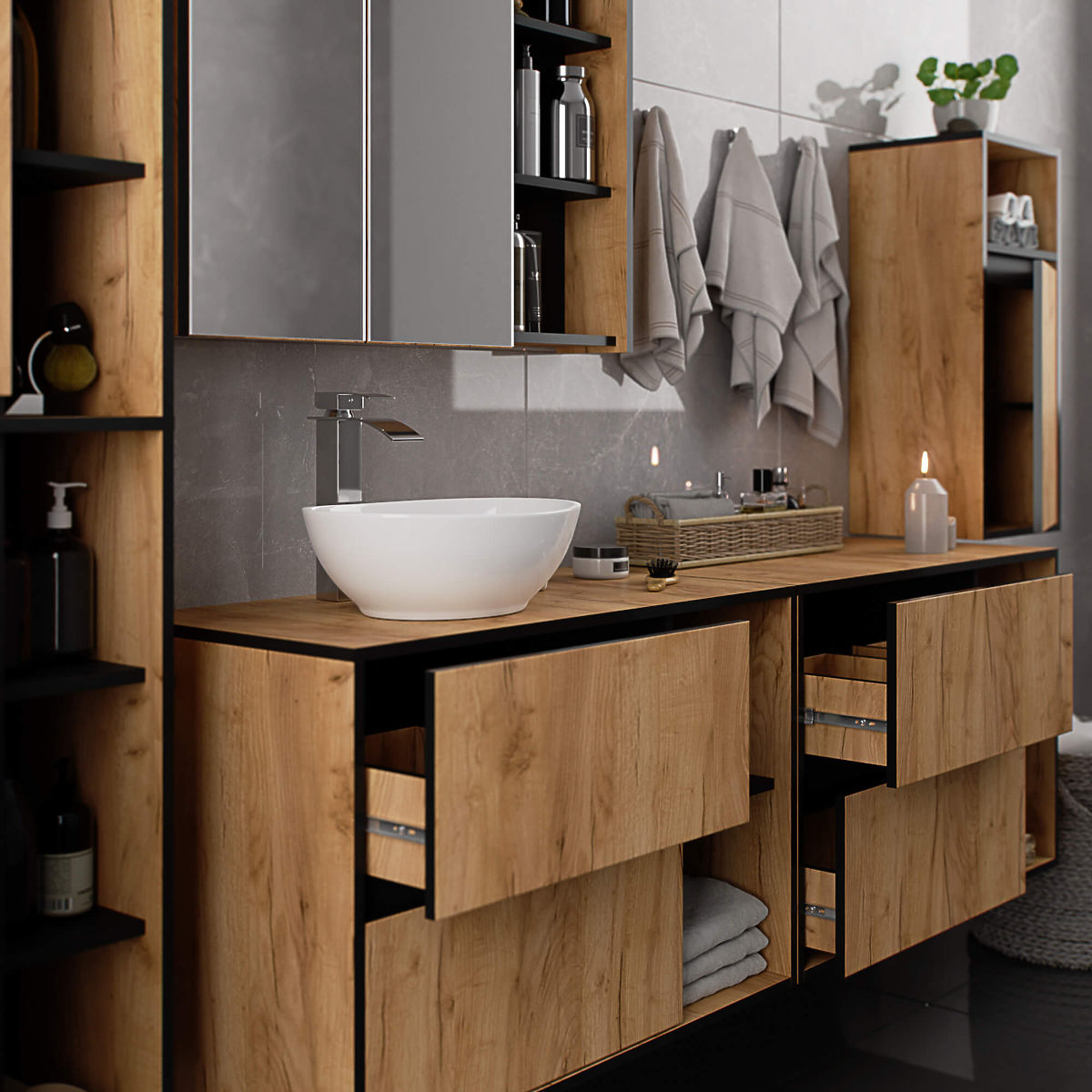 Hanging bathroom cabinet under sink 90 cm VAMI W90 fits perfectly into a modern interior. The configuration with 2 drawers and 2 open shelves offers great convenience in use. Spacious drawers can store hygiene and cosmetic products, while open shelves can hold decorations, adding a personal touch to the interior. This model of hanging cabinet under the sink has 2 holes in the board designed for the installation of a sink and siphon. The cabinet also has specially shaped drawers that allow for the installation of a siphon and hydraulic elements. ATTENTION! The furniture is delivered without a sink and fittings.