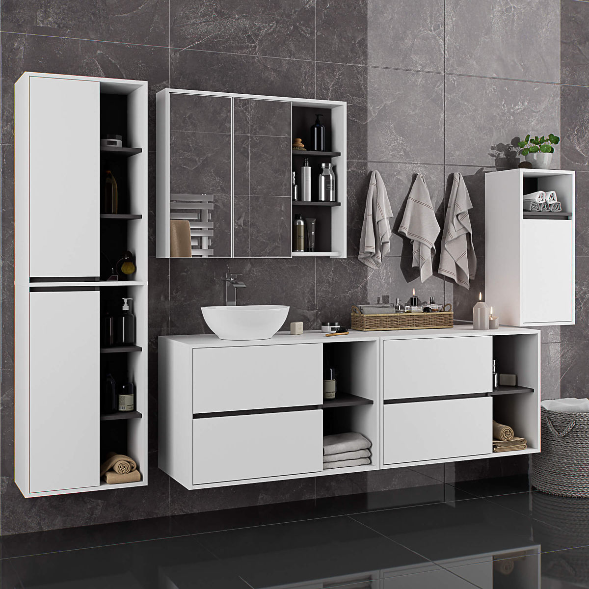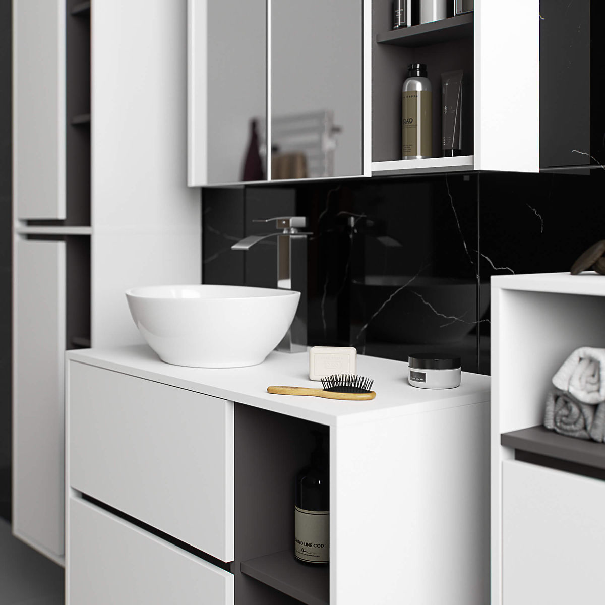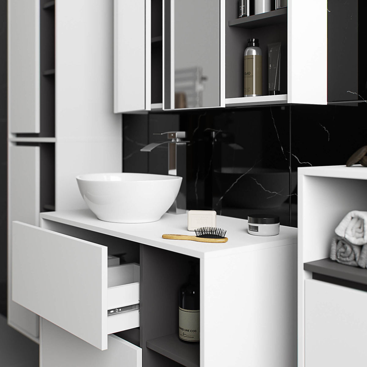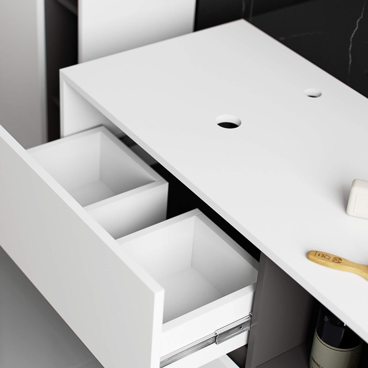 Hanging bathroom cabinet under sink 90 cm VAMI W90 perfectly matches a modern interior. The configuration with 2 drawers and 2 open shelves offers great convenience in use. Spacious drawers can store hygiene and cosmetic products, and open shelves can hold decorations, adding a personal touch to the interior. The described model of the hanging cabinet under the sink has 2 holes in the board intended for the installation of a sink and siphon. The cabinet also has specially shaped drawers that allow for the installation of a siphon and hydraulic elements. ATTENTION! The furniture is delivered without a sink and fittings.