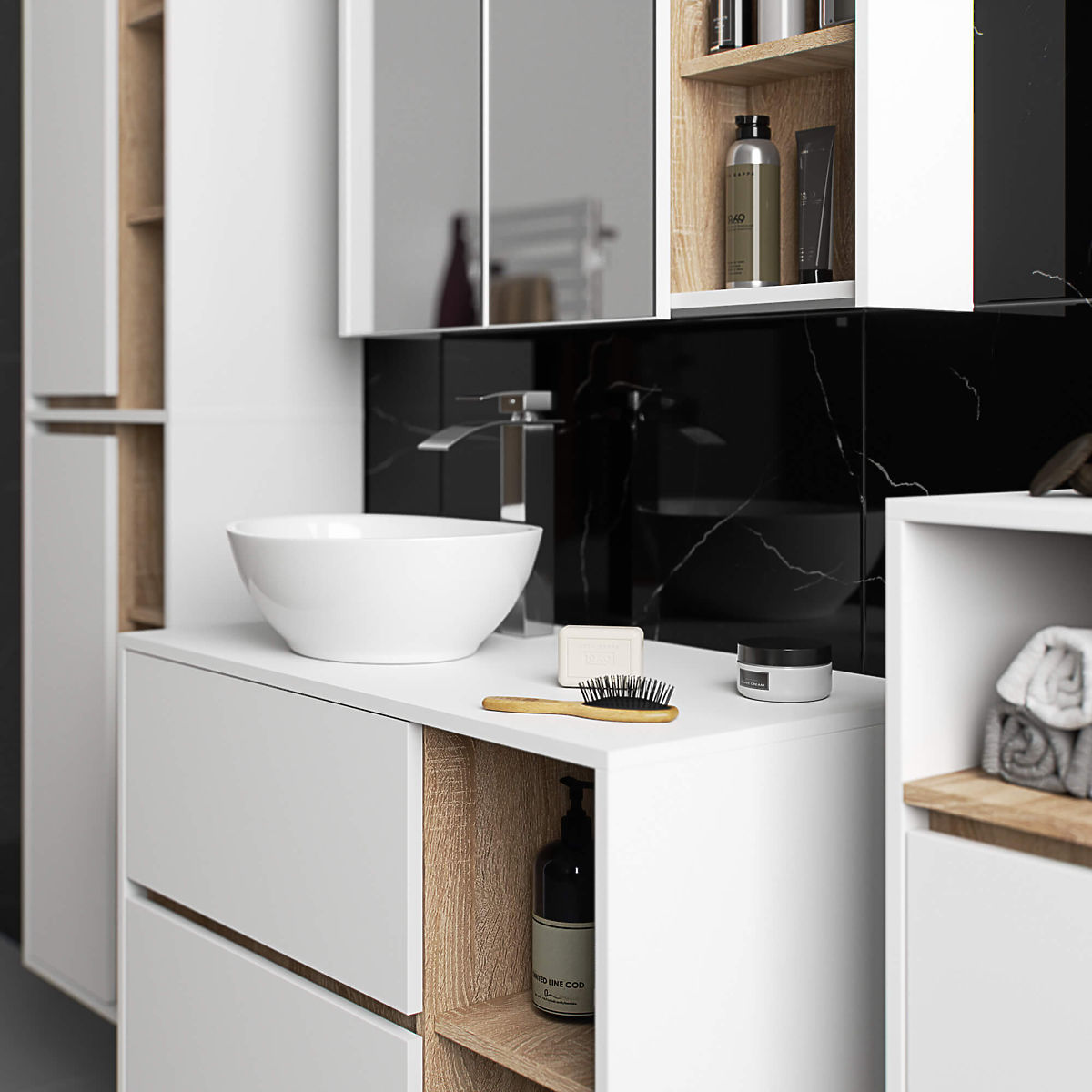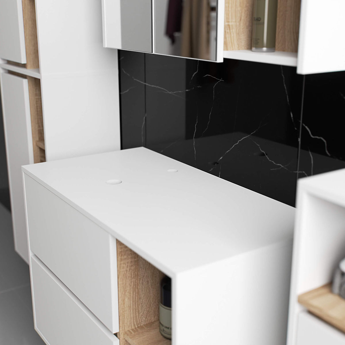 Hanging bathroom cabinet under sink 90 cm VAMI W90 perfectly fits into a modern interior. The configuration with 2 drawers and 2 open shelves offers great convenience in use. Spacious drawers can store hygiene and cosmetic products, while open shelves can hold decorations, adding a personal touch to the interior. This model of hanging cabinet under the sink has 2 holes in the board for mounting the sink and siphon. The cabinet also has specially shaped drawers that allow for the installation of the siphon and hydraulic elements. NOTE! The furniture is delivered without a sink and fittings.