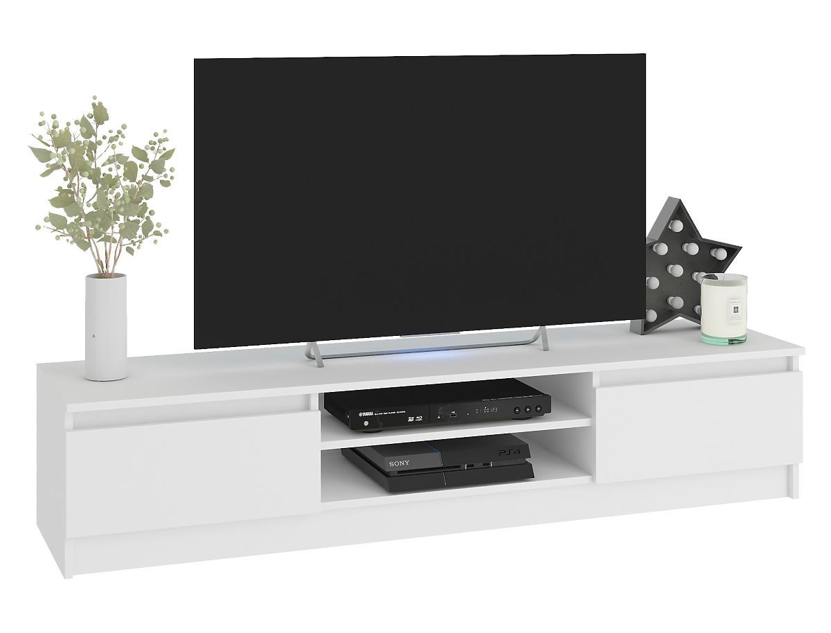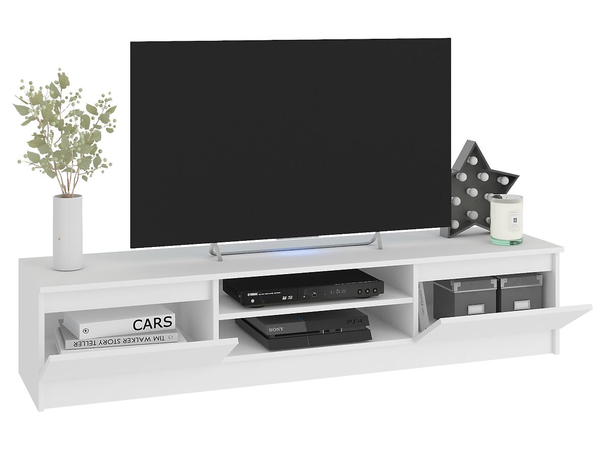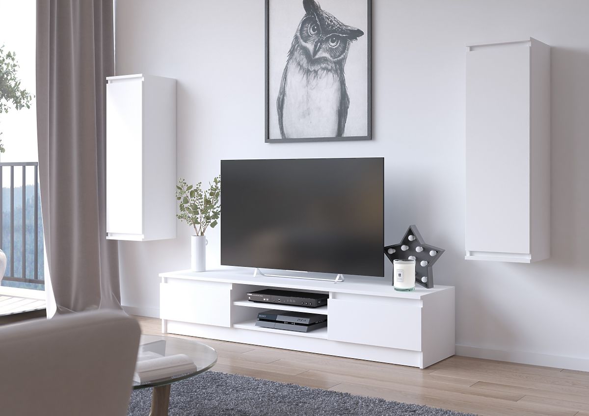 The TV cabinet and wall-mounted cabinets in white color perfectly match a modern interior. The shade of classic white is so universal that the furniture set will look effective in a room with pastel colors as well as in a living room with walls or carpet in darker tones. The furniture is made of laminated board with an ABS edge, which is resistant to abrasion, scratches, and long-term use.