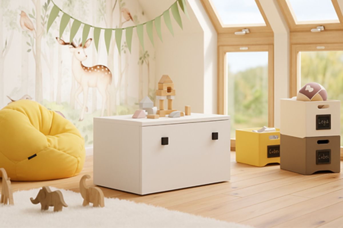 The INGA chest features a modern, minimalist look that fits well with various interior styles. It can serve not only as a storage space for toys but also as a practical hideaway in other rooms. Made from durable laminated board and equipped with a PVC edge, it guarantees strength and easy maintenance.