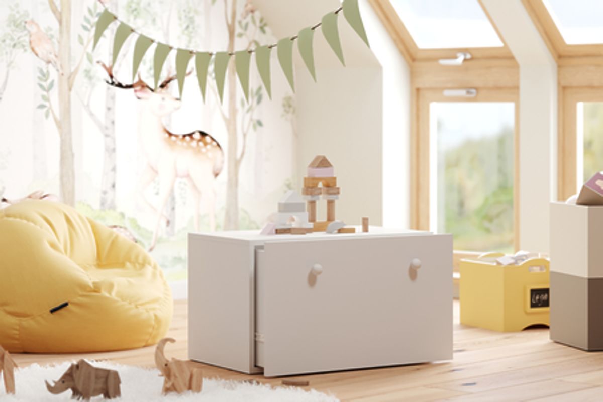 The INGA chest features a modern, minimalist appearance that fits well with various interior styles. It can serve not only as a storage space for toys but also as a practical box in other rooms. Made from durable laminated board and equipped with a PVC edge, it guarantees strength and easy maintenance of cleanliness.