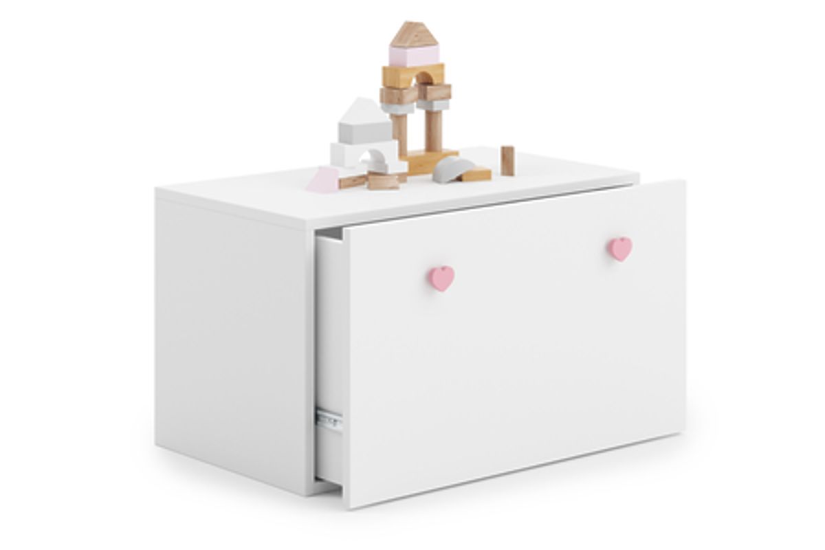Spacious toy chest with a modern, minimalist design and pink handle. .. more