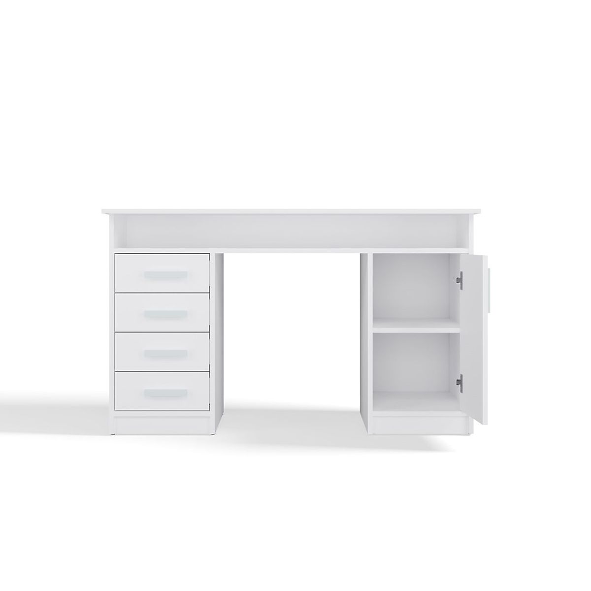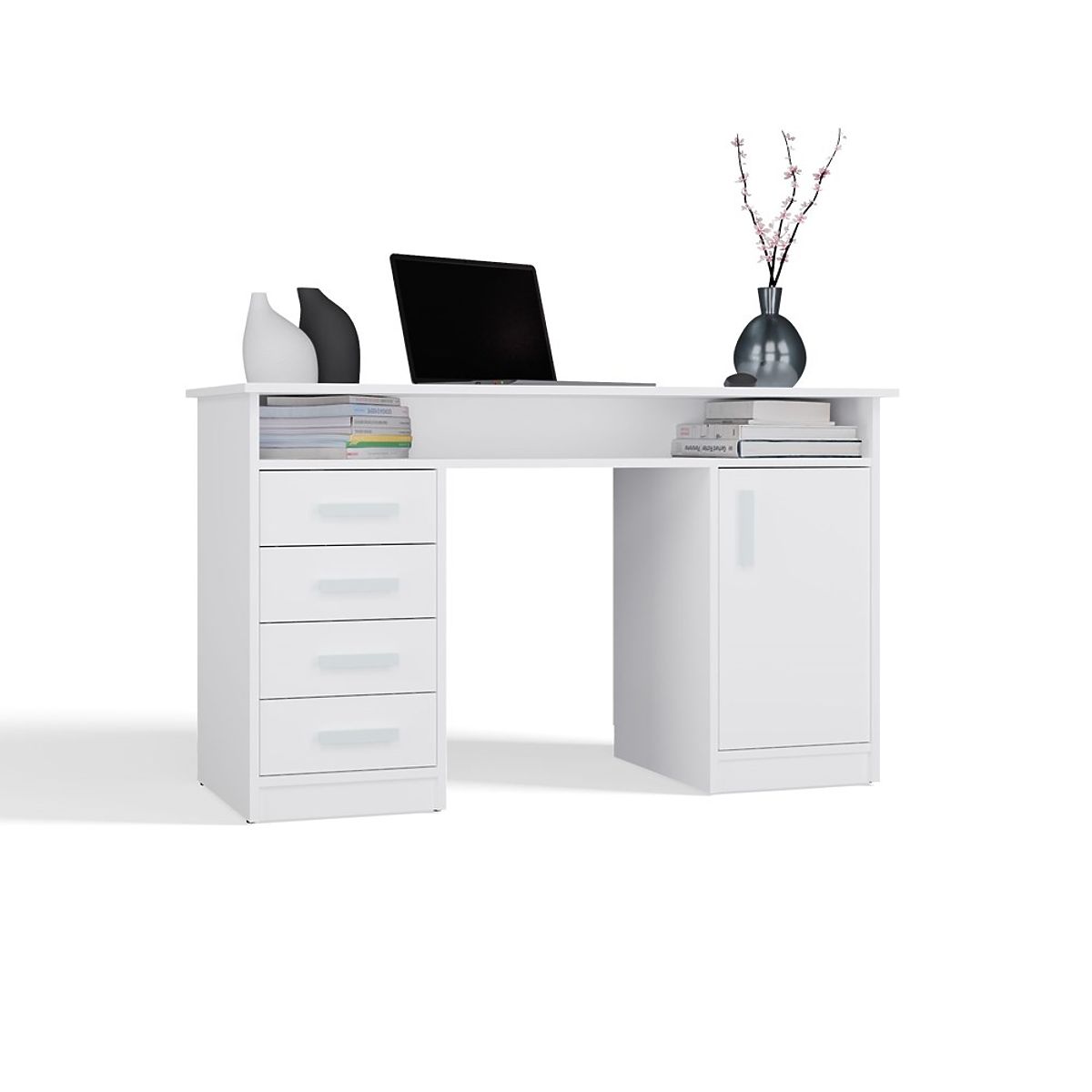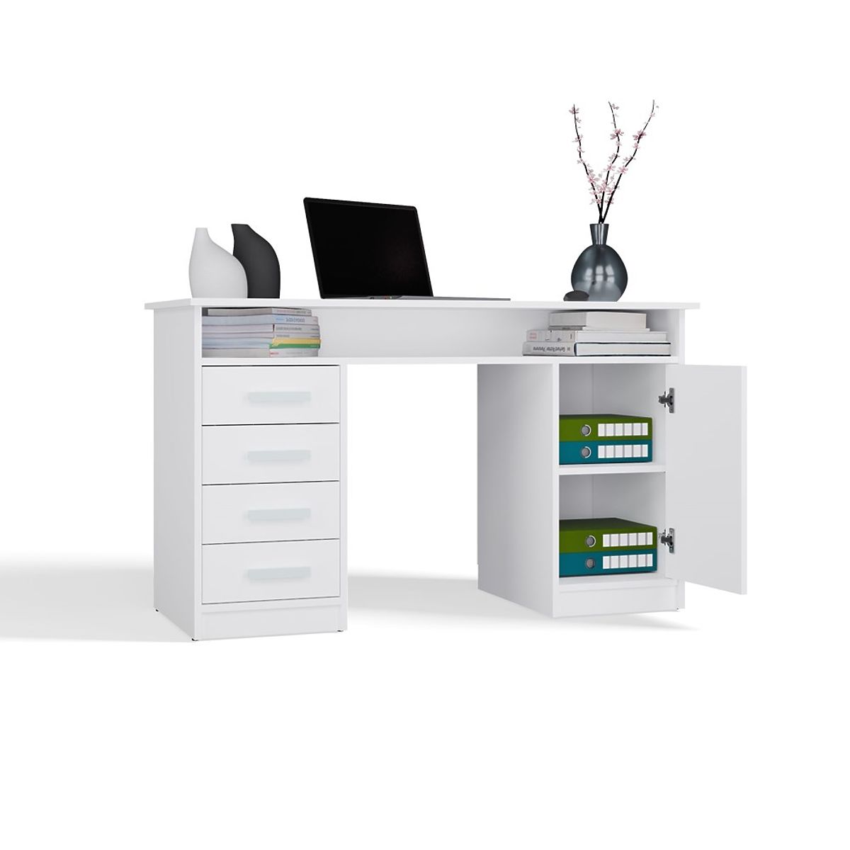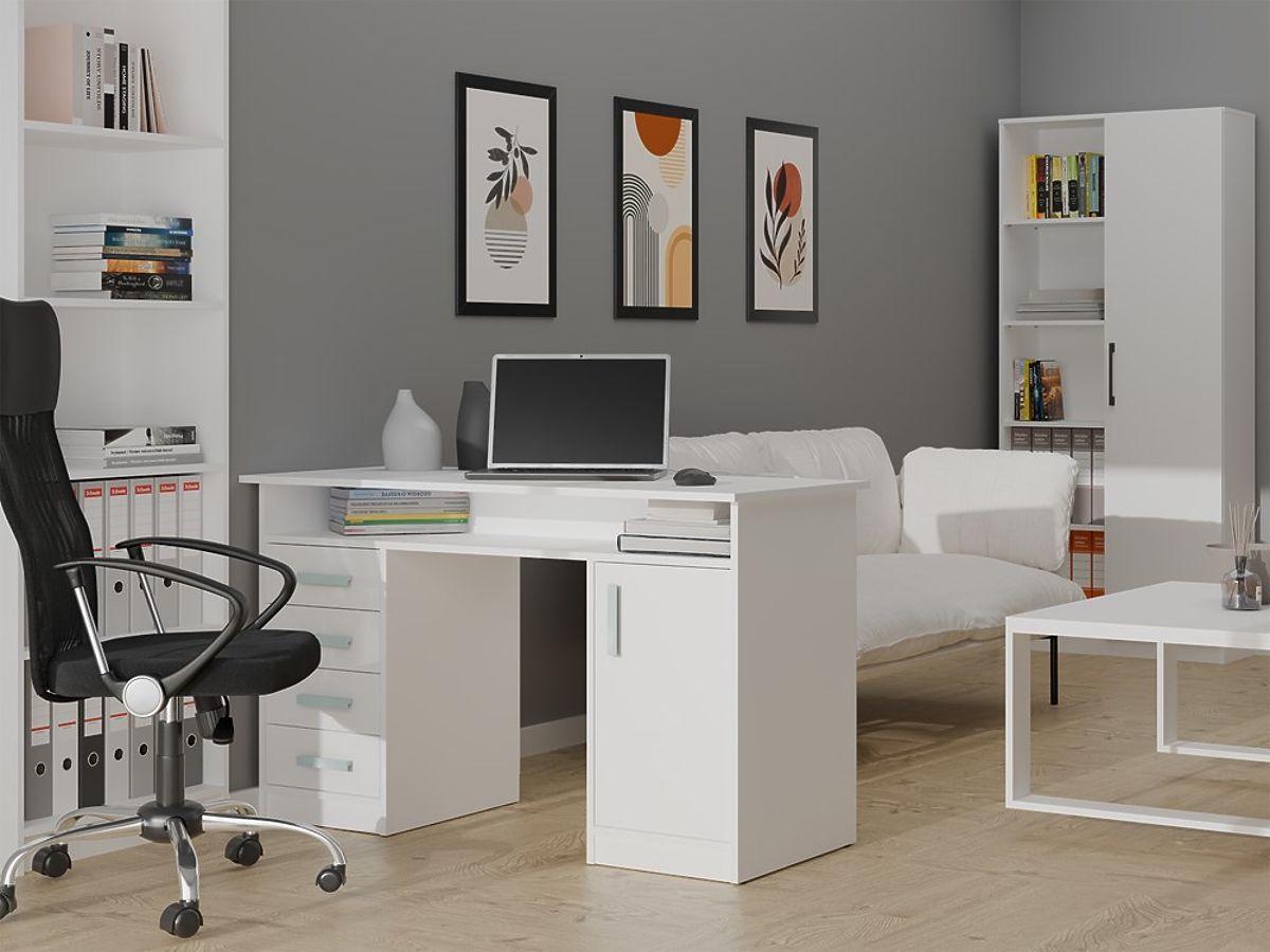 Equipped with 4 drawers and a closed cabinet with 1 door and 2 shelves, it provides plenty of storage space for documents, books, or office accessories. An additional open shelf under the top is perfect for small items, a laptop, or notebooks.