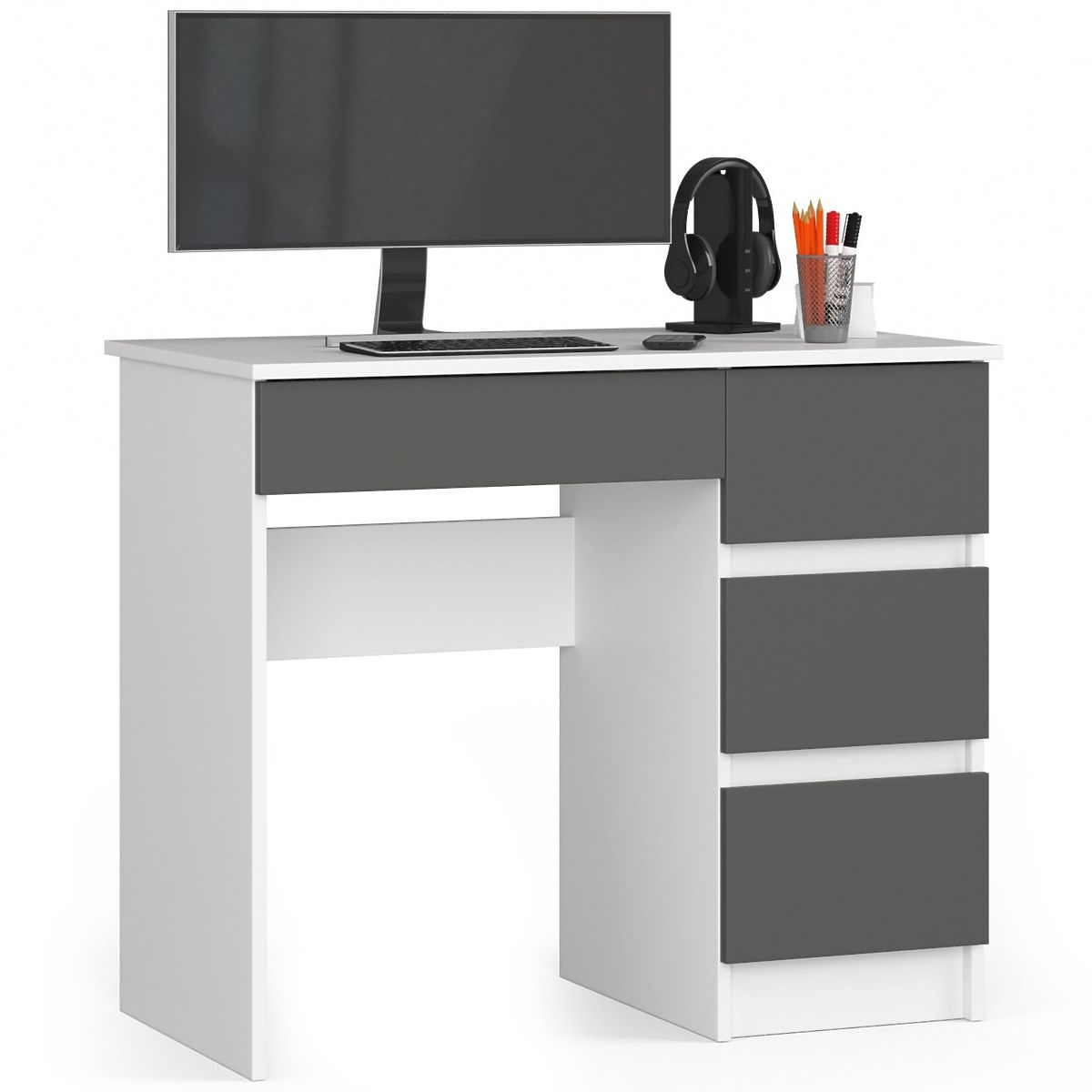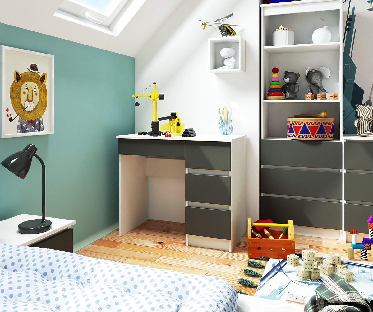 The Computer Desk A-7 is a small piece of furniture that fits well in a small space - whether in an office or living area. It is suitable for a home office or a children's/youth room. The presented product combines two contrasting but complementary colors - graphite gray and white. It consists of three drawers for versatile arrangement. Simple in form yet exceptionally functional, this furniture will be appreciated by those who want to create a work or study corner but have limited space.