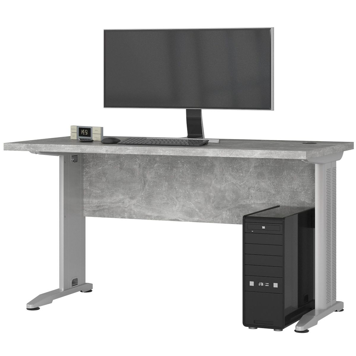 The freestanding BM-135 desk in concrete color is an ideal solution for a computer workstation in any home or office. The furniture is made of 32-millimeter thick laminated board, which is durable and abrasion-resistant. The visible edges of the desk are equipped with ABS edging, which also features high resistance to damage. The matte tabletop and back perfectly match the metal legs. If you are looking for a design with a large work surface, we recommend exploring our offer. We guarantee the highest quality, functionality, modern design, and favorable price. You can customize additional office furniture available in our online store to match the desk. We hope it meets the expectations of even the most demanding customers. The desk is easy to clean, and its simple yet elegant form makes the furniture timeless and versatile.
