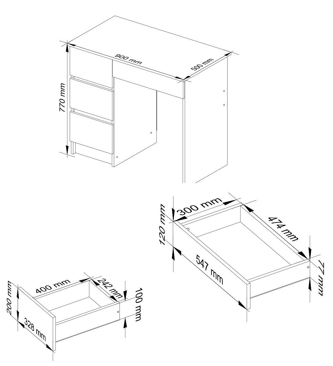 The desk measures 90 cm in length, 77 cm in height, and 50 cm in depth. It is made from 16 mm thick laminated board, which is highly resistant to abrasion. Additionally, it features a keyboard shelf that, like the drawers, moves on metal ball-bearing slides. This ensures smooth movement when pulling out, and the drawer can be easily removed if needed. The edges of the desk are covered with ABS edging, which protects against mechanical damage and further scratches.