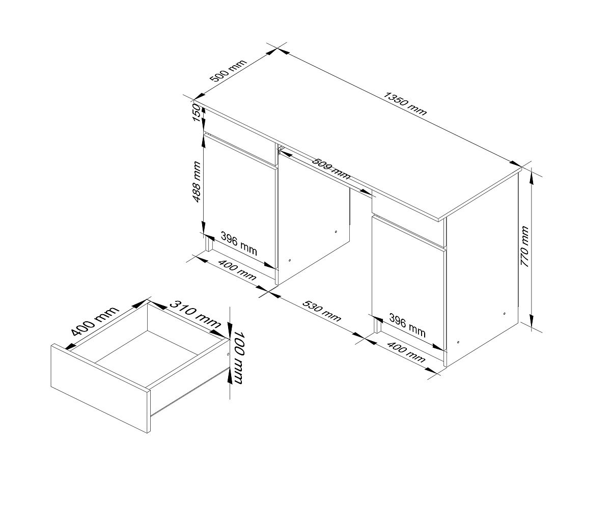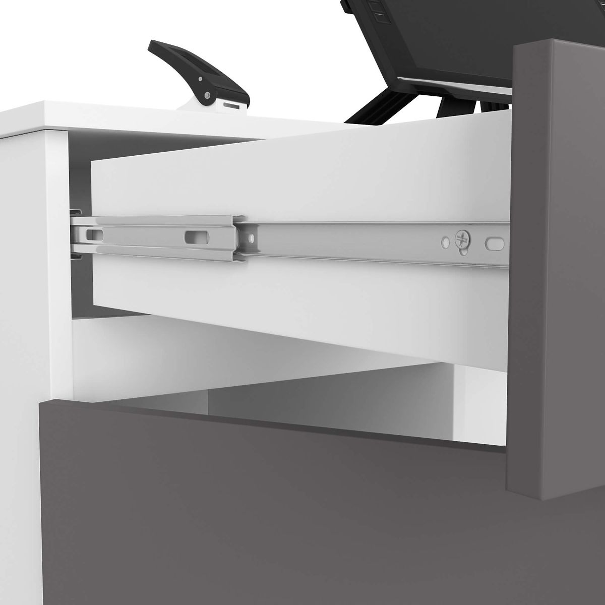 - Drawers and keyboard shelf move on metal ball guides