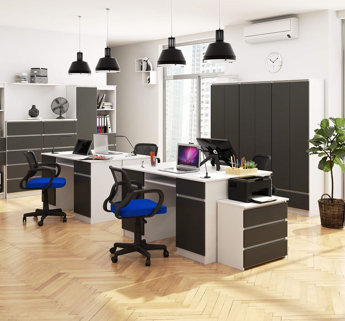 Desk with graphite gray fronts and pull-out keyboard shelf. .. more