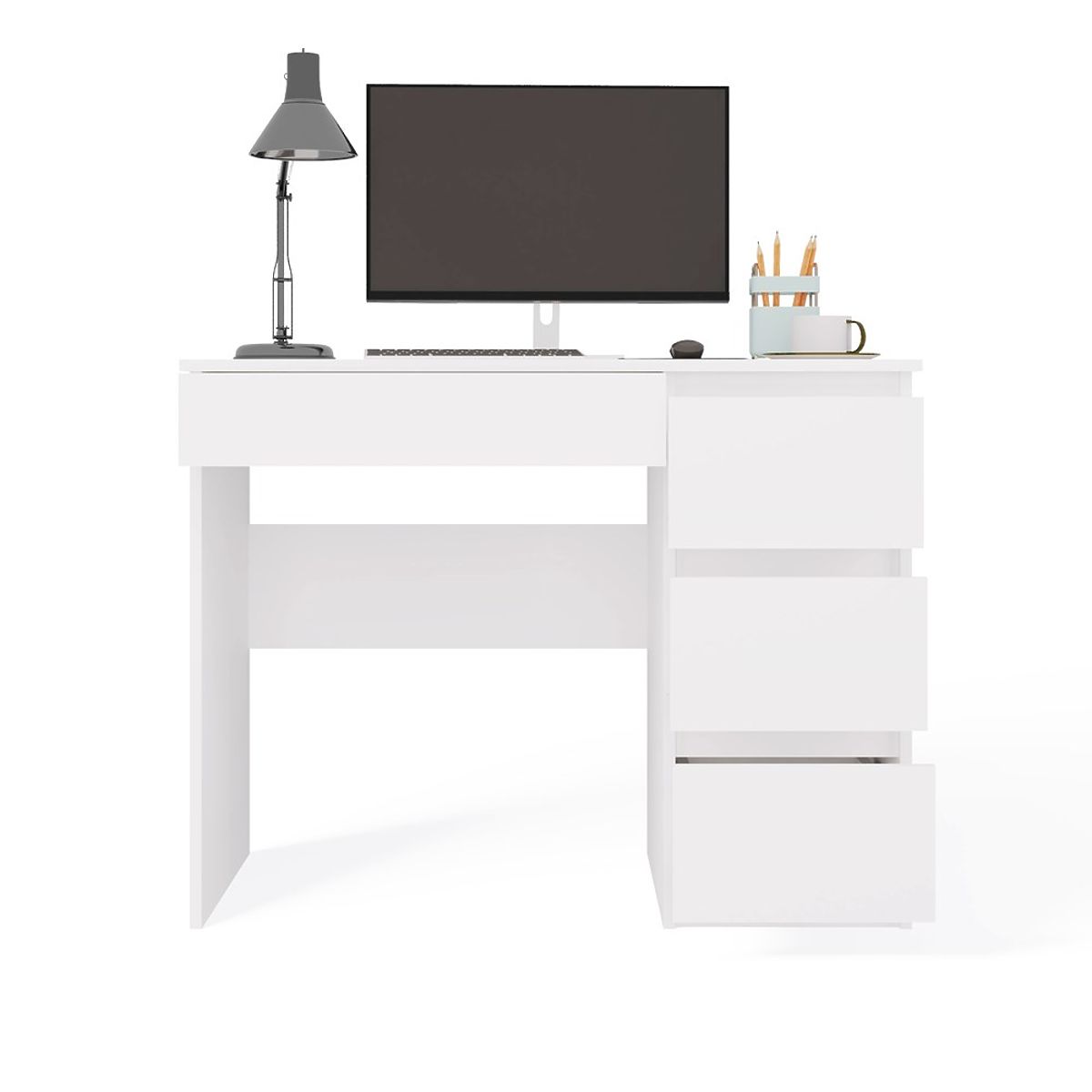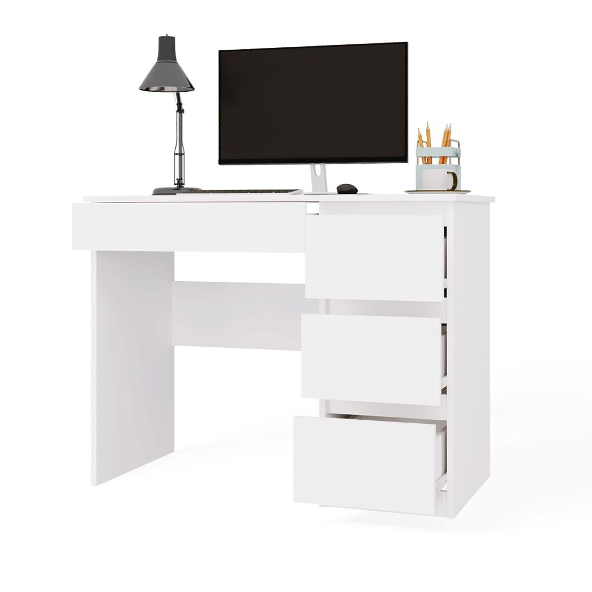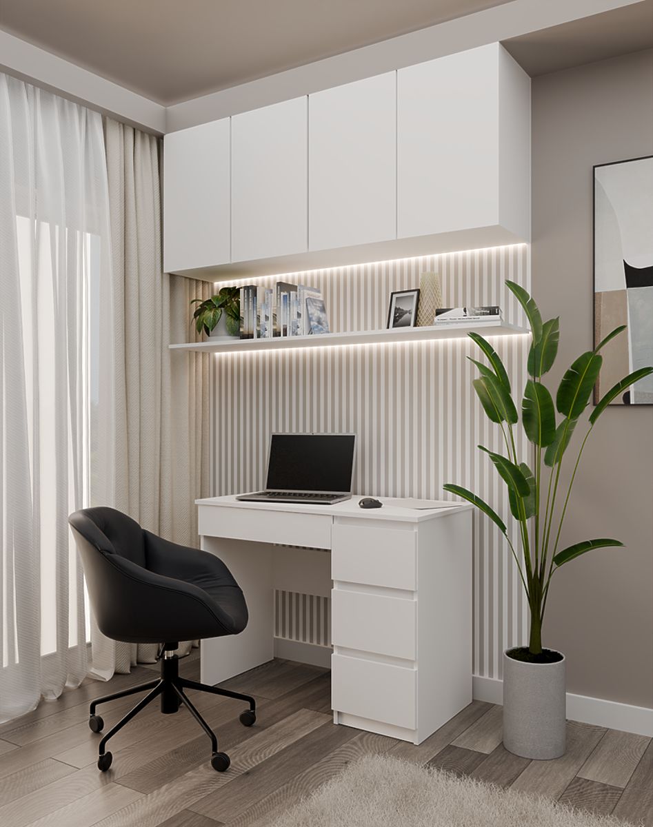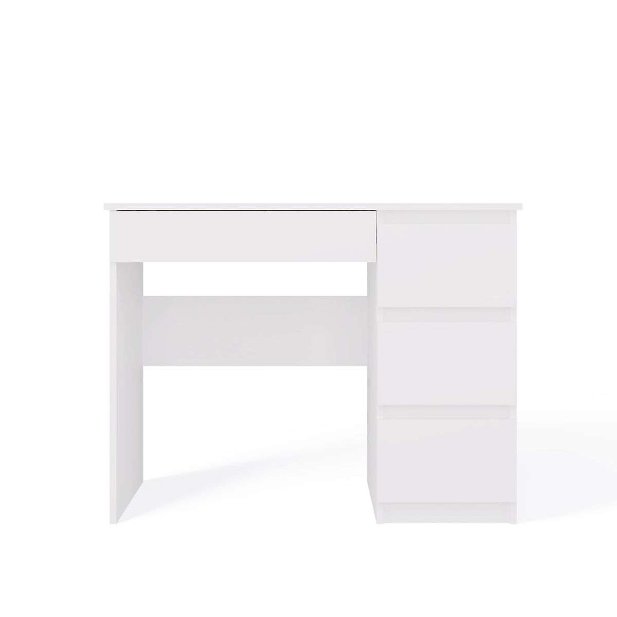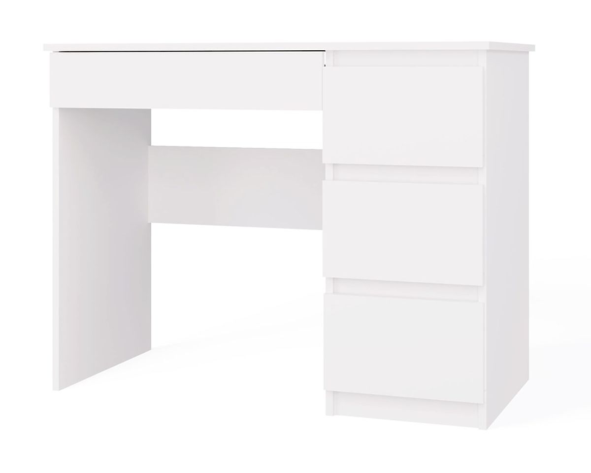 COLOR: WHITE The desk model "MIJAS" is perfect for both home rooms and offices. ideal place for a laptop drawer fronts without handles 3 spacious high drawers on the left and one low one on the right under the table top functionality simple and modern design creates a comfortable workspace smooth sides without covers easy assembly assembly instructions in the package Czech manufacturer (if you want, I can add a "Polish producer" - write what you prefer) MATERIAL: Body and fronts - laminated chipboard 16 mm.