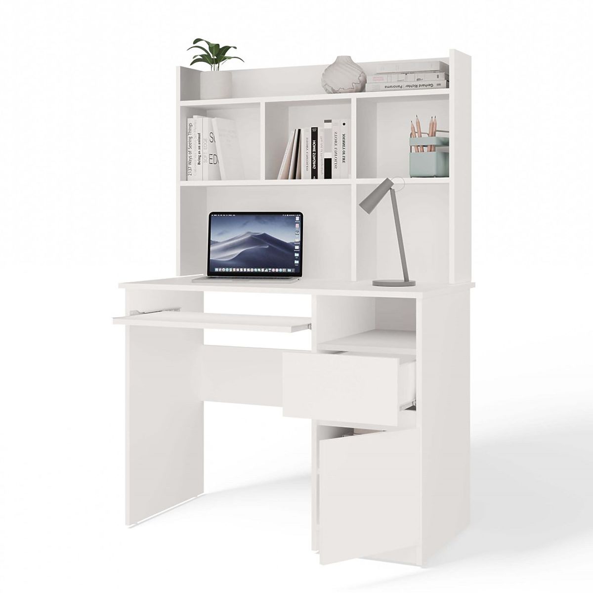 The modern design, matte white finish, and practical storage arrangement make this furniture suitable for both youth and children's rooms, as well as home offices.