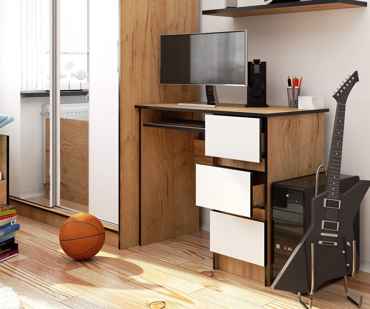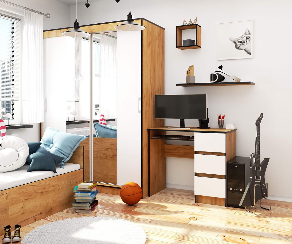 The A-6 desk, 90 cm long in oak craft shade with white fronts, fits perfectly into both classic and modern interiors of children's or youth rooms due to its universal and timeless appearance. It can also be successfully used as part of a home office setup. Everything depends on the individual needs and preferences of the user. With three practical drawers, you gain additional storage space for various items you want to keep handy.