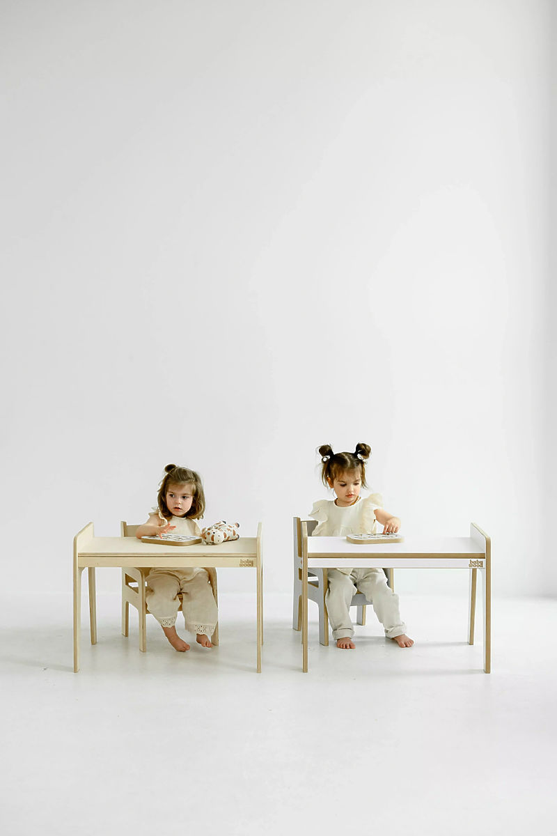 Table and Chair Set is the perfect solution for little explorers and creative minds. It has been designed with an emphasis on comfort, safety, and freedom of movement during play, drawing, and learning. The minimalist shape, timeless design, and natural materials make the set a beautiful and functional element of a child's room. Rounded edges and stable construction provide maximum safety, while the correct furniture height supports the child's independence and healthy sitting posture.