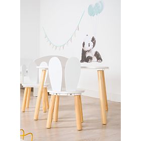 Children's table and 2 chairs in a combination of white and natural wood. This original furniture set will brighten up rooms for both boys and girls. The chairs with bunny ears look adorable and resemble little rabbits.