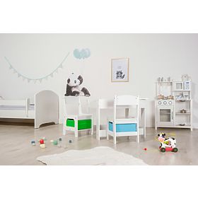 A beautiful table with chairs will find its place in every child's room. It offers a versatile tabletop that can be transformed into a black chalkboard. Practical boxes in blue and green provide additional storage space.