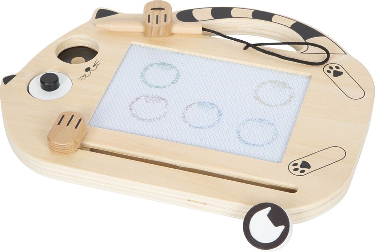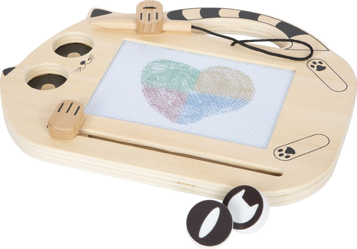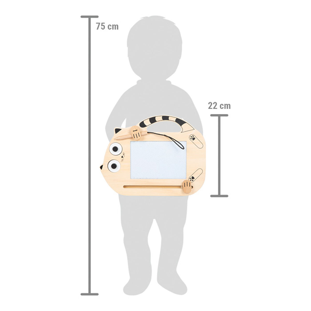 Creative fun for young artists! The magnetic drawing board in the shape of a cat is perfect for children who love to draw. Using the pen, new pictures can be created over and over again. Two stamps with cat eye and cat head motifs offer additional possibilities for creating unique artworks. When the pen is not in use, it can be securely clipped under the cat's paw, and thanks to being attached to the board with a string, it won't get lost. When the masterpiece is complete or you want to create something new, the image can be easily erased with the slider – so everything is ready for more creativity in no time! With the integrated carrying handle and compact dimensions, the board can be taken anywhere. Enjoy creative fun that never ends, even on the go! Main features: with a wooden pen and 2 stamps, pen attached to the board with a string under the paw, endless drawing with a magic eraser, with a carrying handle, made from high-quality wood, suitable for travel.