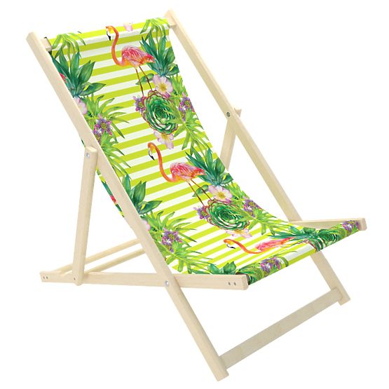 Beautiful beach chair with flamingo pattern and tropical flowers. The fabric has a beautiful green color with white stripes. A children's beach chair is a great alternative to a garden chair or armchair.