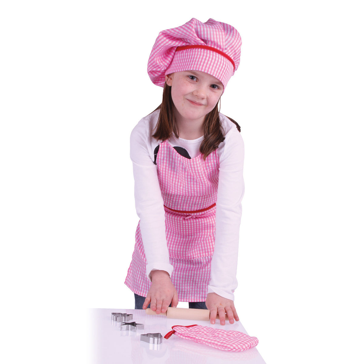 Young chefs will love this bright and pretty pink cotton baking or cooking set that includes an apron, oven mitt, chef's hat, rolling pin and cookie cutters. Ideal for use in assisted cooking or baking, or for use in our wooden kitchen range as part of role plays that your child is sure to enjoy creating. We also have the set available in blue here. The package includes everything as shown in the picture. Main features: hat: velcro closure, circumference approx. 47-51 cm gloves: length 17 cm apron: length: without laces 56 cm + laces 29 cm, width 46 cm + each lace 42 cm