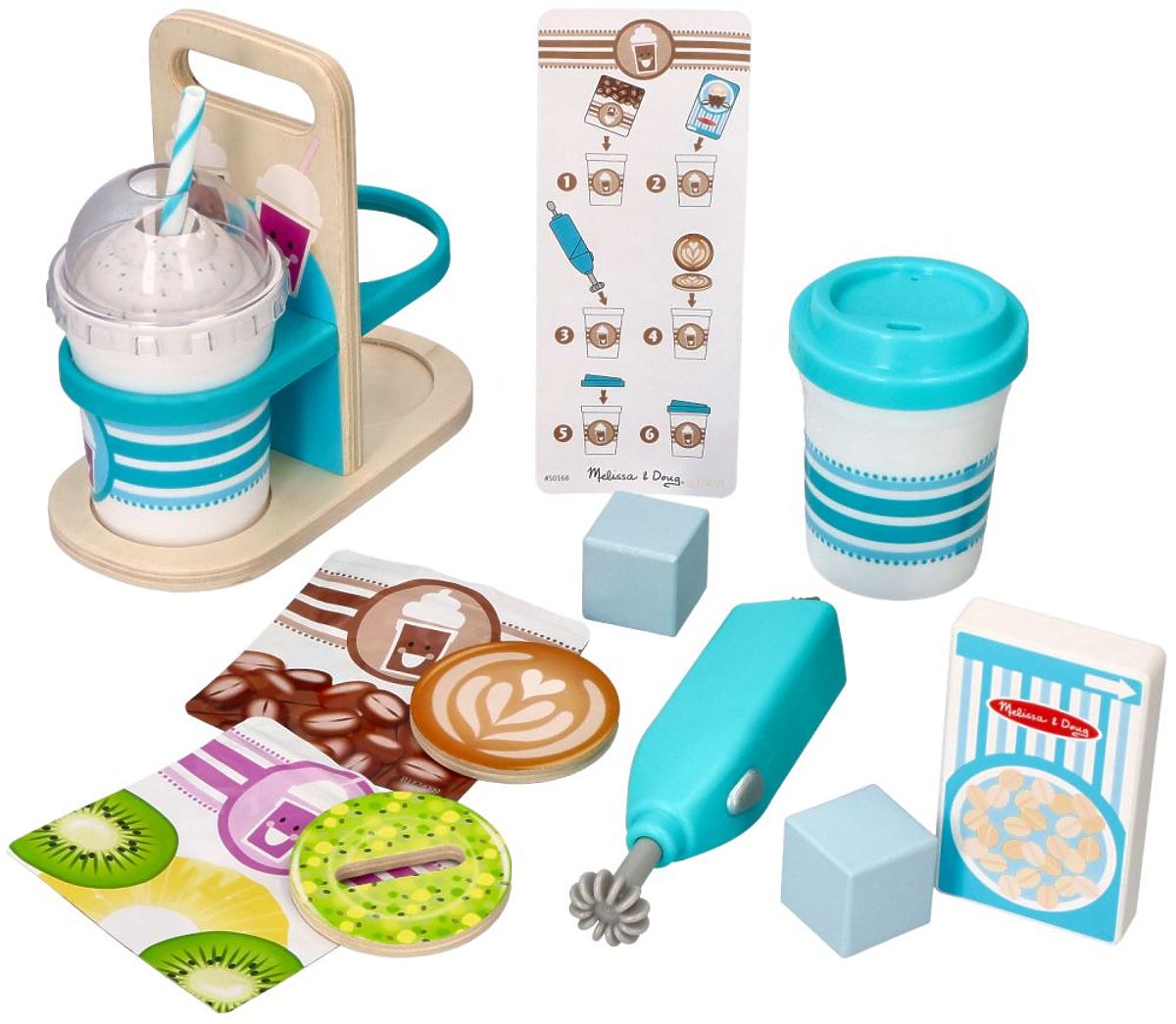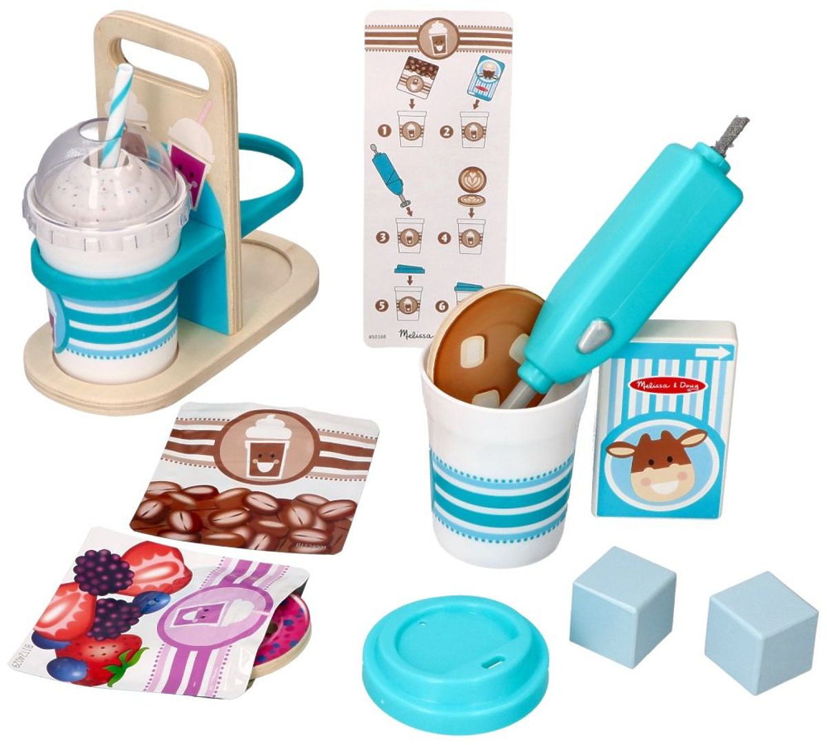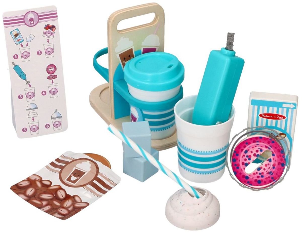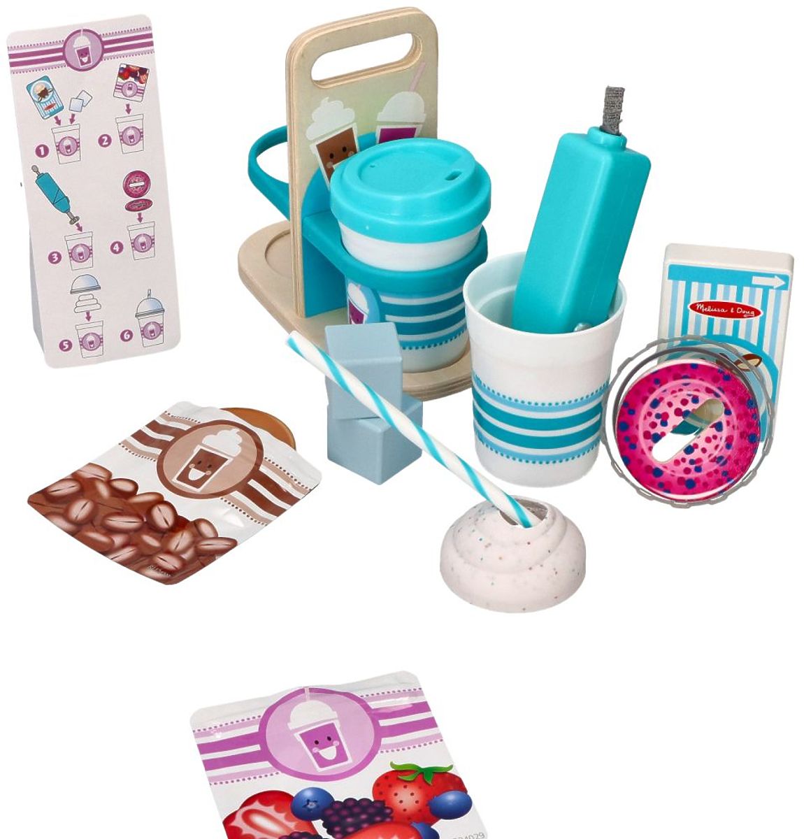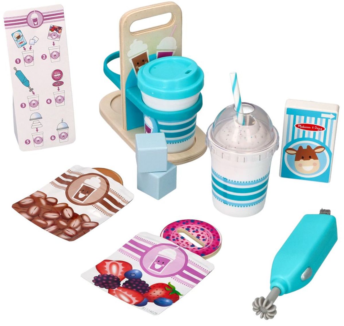 Prepare a delicious smoothie (blueberry or vegetable), mix the drink using the vibrating frother, add wooden ice cubes, and finally put on the lid and add the straw. Warm up by drinking hot cocoa or coffee with the hot drink lid on the go. Drinks can be carried in a wooden container, making role play so realistic.
